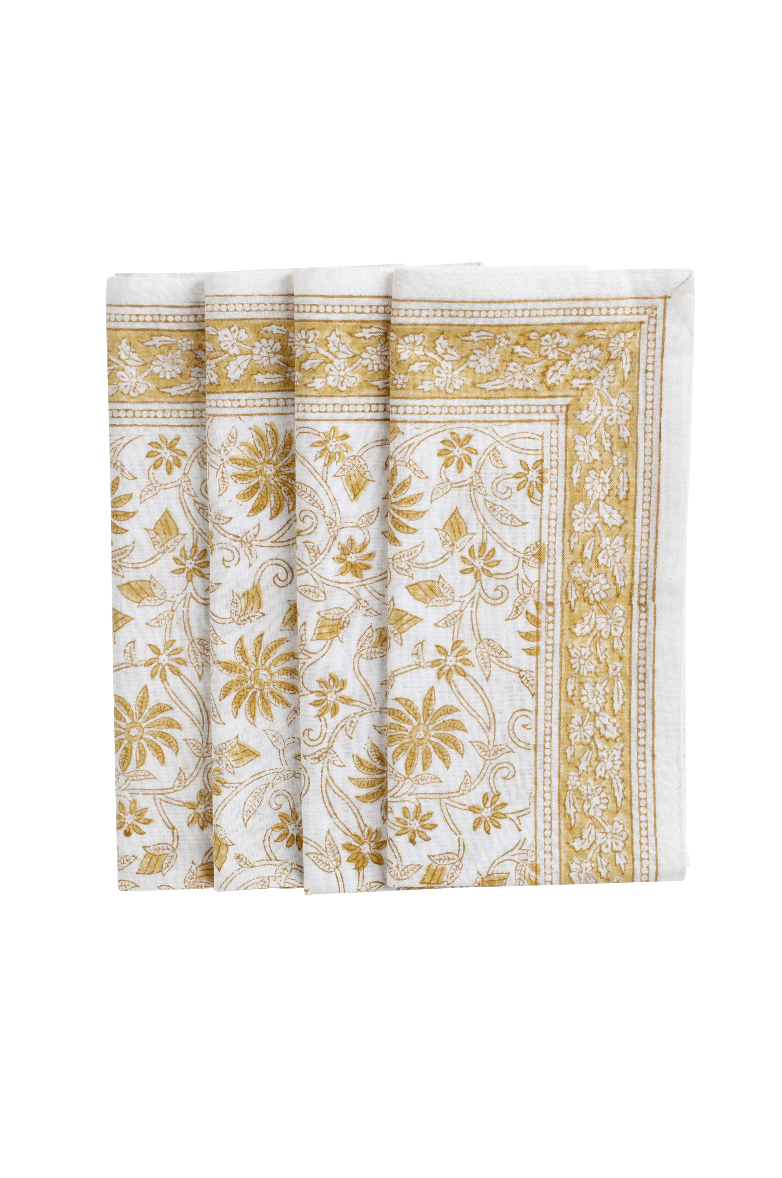 Neljä puuvillaista lautasliinaa, joissa kukallinen kuvio ja koristeboordi. Kuvio on painettu käsin perinteisellä intialaisella blockprint-tekniikalla. Ikiaikainen tekniikka antaa tekstiileille eloisan ja koristeellisen ilmeen. Pesu 30 asteessa villa-/silkkiohjelmalla ja miedolla nestemäisellä pesuaineella. Älä käytä valkaisuainetta. Ei rumpukuivausta. Voidaan silittää lämmöllä.