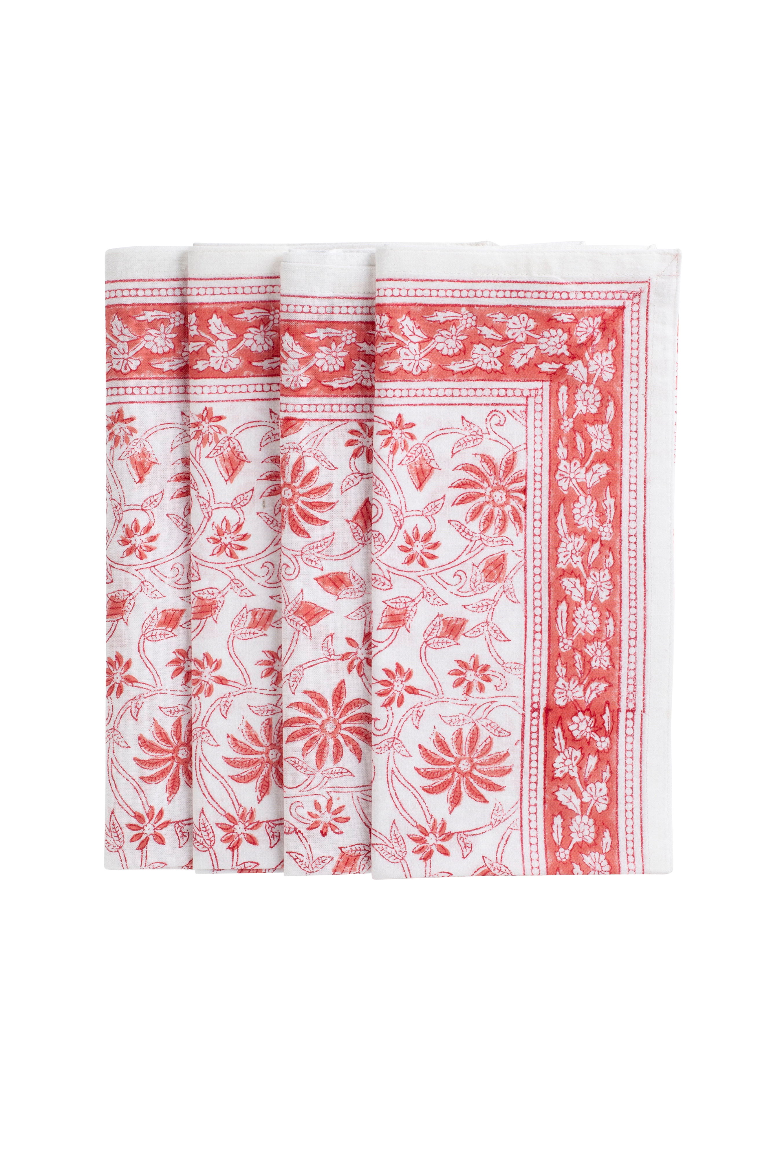 Neljä puuvillaista lautasliinaa, joissa kukallinen kuvio ja koristeboordi. Kuvio on painettu käsin perinteisellä intialaisella blockprint-tekniikalla. Ikiaikainen tekniikka antaa tekstiileille eloisan ja koristeellisen ilmeen. Pesu 30 asteessa villa-/silkkiohjelmalla ja miedolla nestemäisellä pesuaineella. Älä käytä valkaisuainetta. Ei rumpukuivausta. Voidaan silittää lämmöllä.