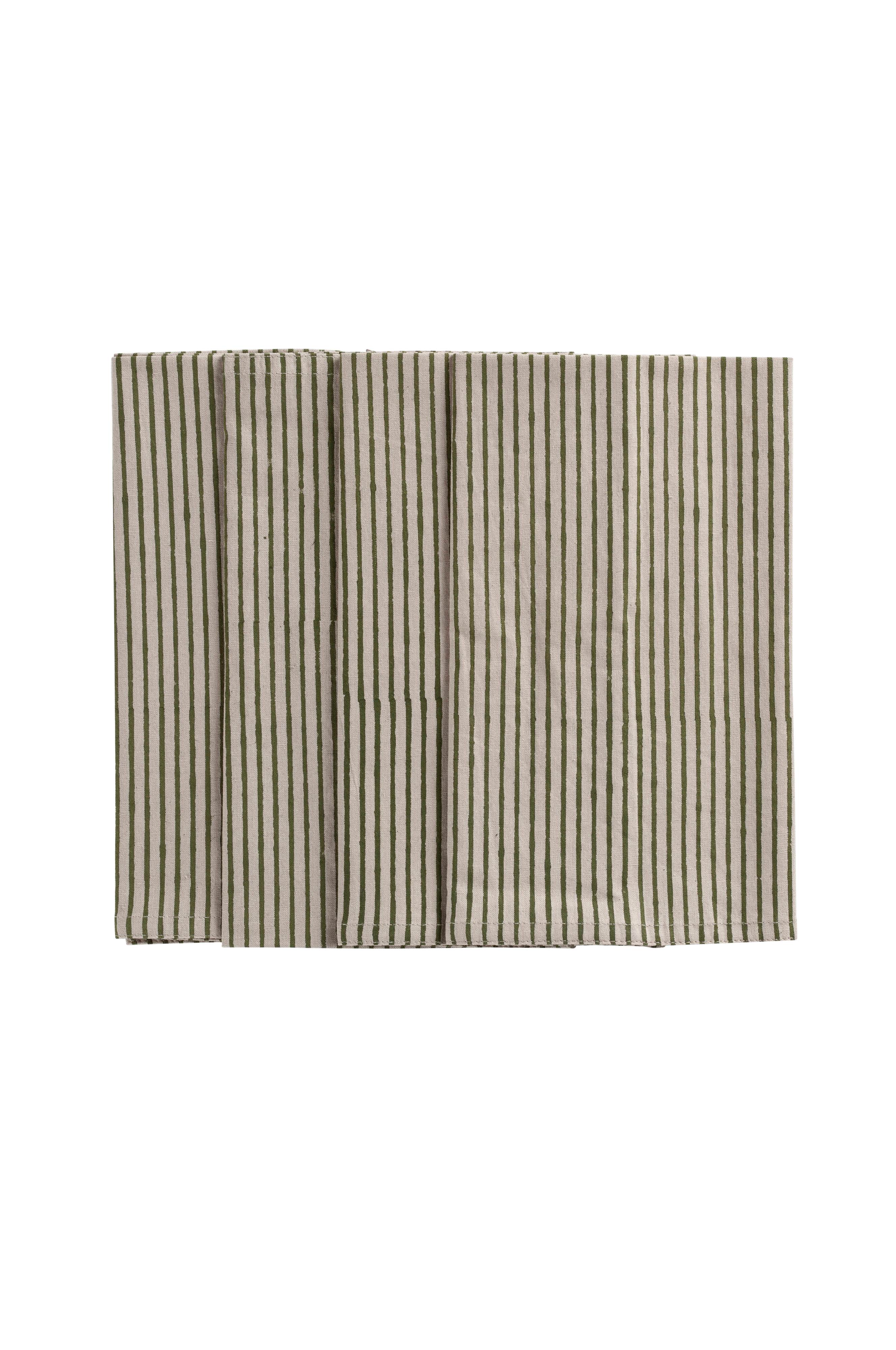 Neljän puuvillaisen lautasliinan sarja, jossa on klassinen stripe kuvio. Kuvio on painettu käsin perinteisellä intialaisella painotekniikalla. Perinteinen painomenetelmä, joka antaa jokaiselle tekstiilille ainutlaatuisen ja koristeellisen ilmeen. Pese lautasliinat huolellisesti villalle/siidolle tarkoitetulla lyhyellä (max 1 tunti) ja hellävaraisella ohjelmalla miedolla pesuaineella.