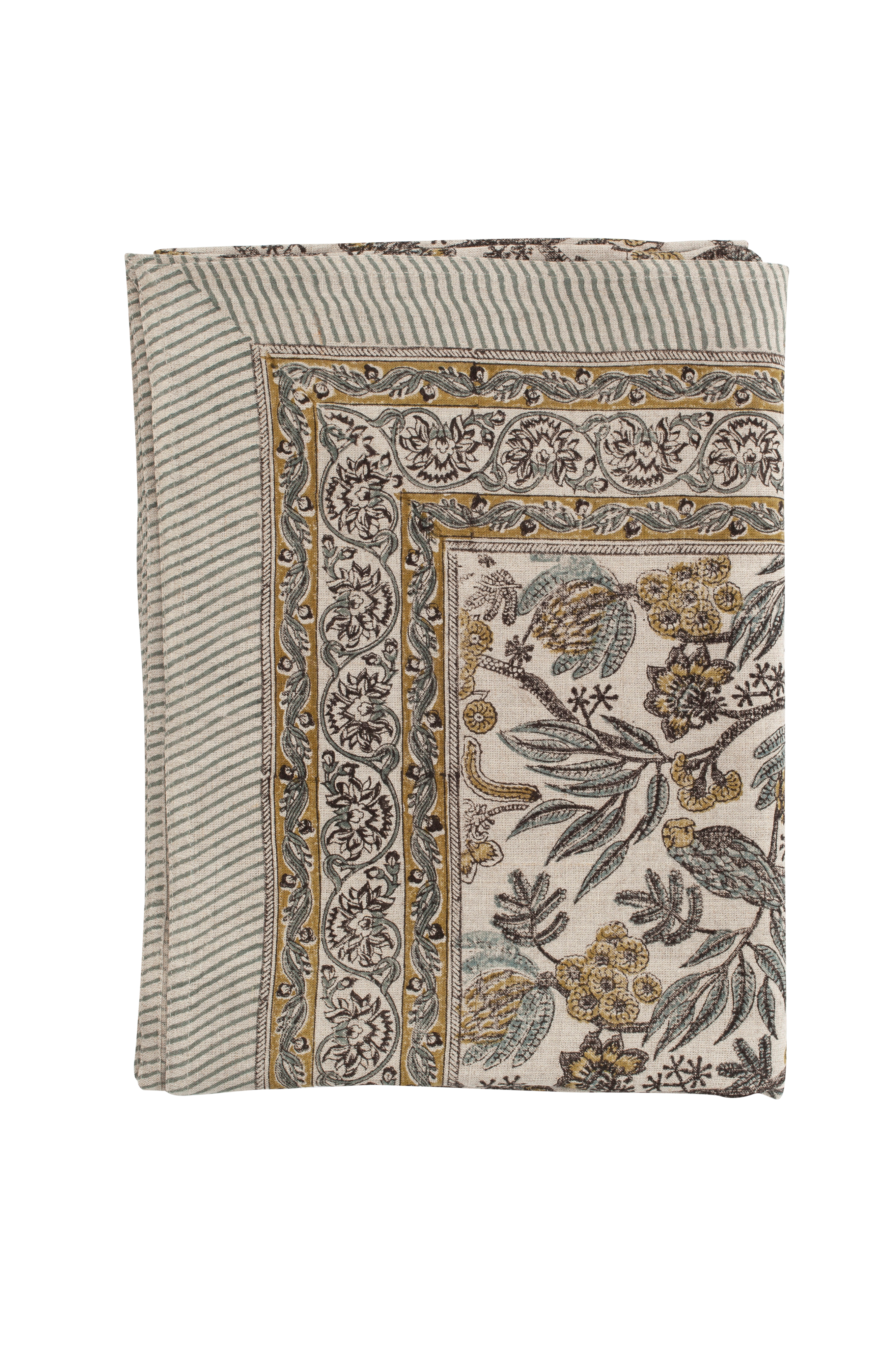 Raskaasta pellavasta valmistettu eksklusiivinen pöytäliina, jossa on kaunis kuvio, jossa on lintuja ja kukkia sekä koristeellinen reunus. Kuvio on painettu käsin perinteisellä intialaisella painotekniikalla. Ainutlaatuinen käsityö, joka antaa jokaiselle pöytäliinalle ainutlaatuisen ja koristeellisen ilmeen. Pese pöytäliina lyhyellä (enintään 1 tunti) ja hellävaraisella ohjelmalla villalle/siidalle miedolla pesuaineella.