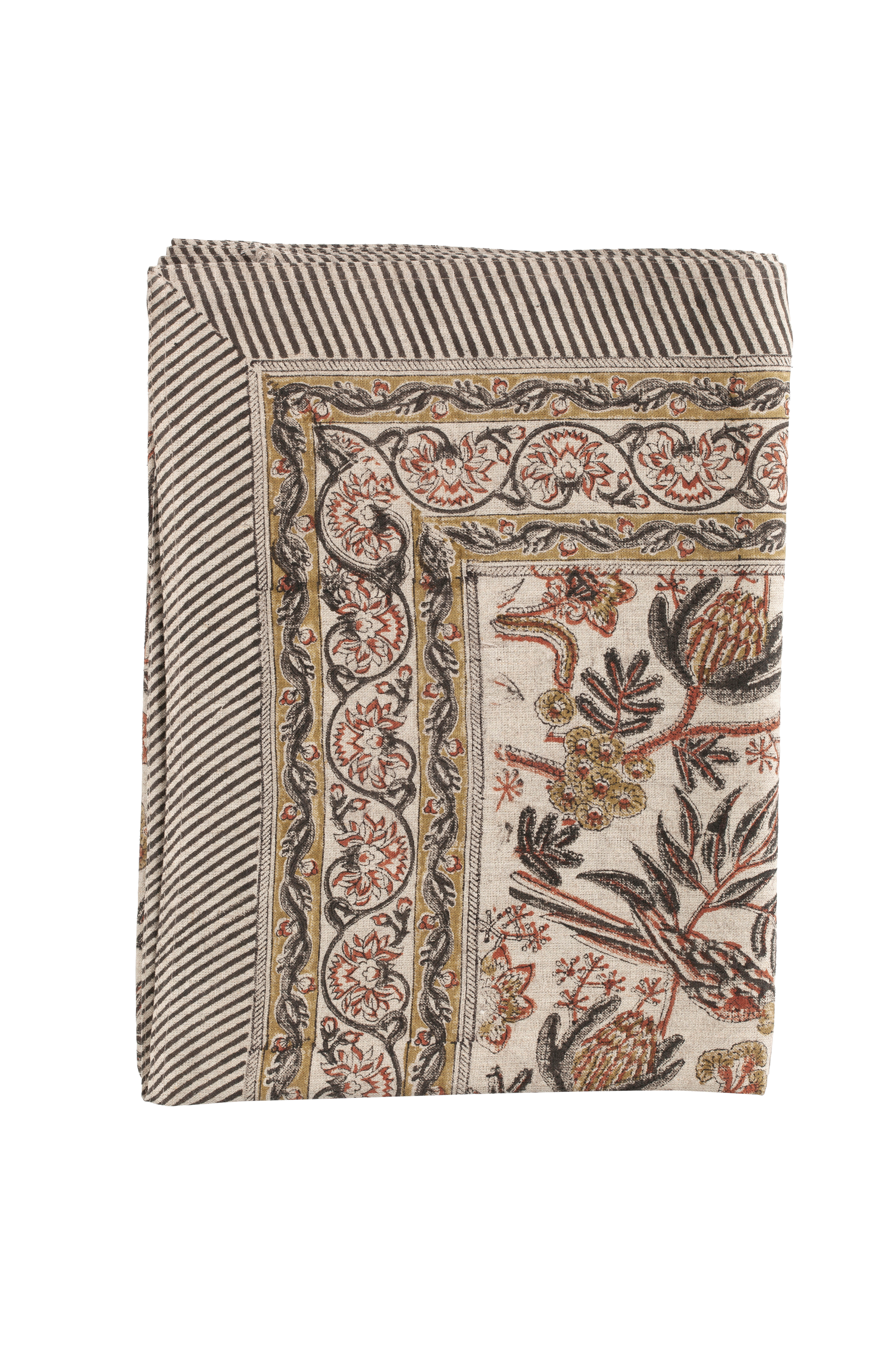 Raskaasta pellavasta valmistettu eksklusiivinen pöytäliina, jossa on kaunis kuvio, jossa on lintuja ja kukkia sekä koristeellinen reunus. Kuvio on painettu käsin perinteisellä intialaisella painotekniikalla. Ainutlaatuinen käsityö, joka antaa jokaiselle pöytäliinalle ainutlaatuisen ja koristeellisen ilmeen. Pese pöytäliina lyhyellä (enintään 1 tunti) ja hellävaraisella ohjelmalla villalle/siidalle miedolla pesuaineella.