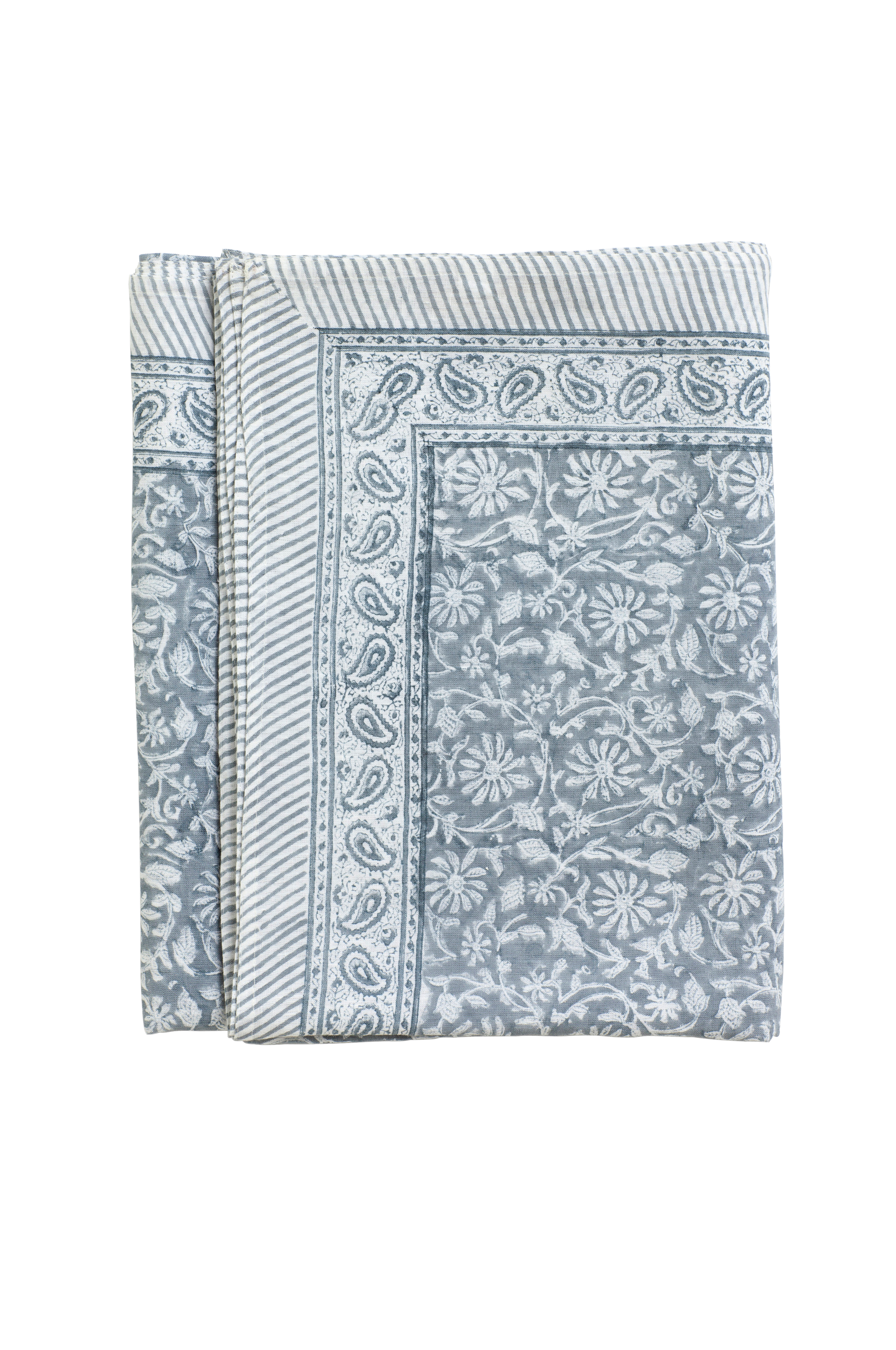 Elegantti pellavapöytäliina, jossa kaunis kuvio. Kuvio on painettu käsin perinteisellä intialaisella blockprint-tekniikalla. Ainutlaatuinen käsityö antaa pöytäliinalle elävän ja koristeellisen ilmeen.