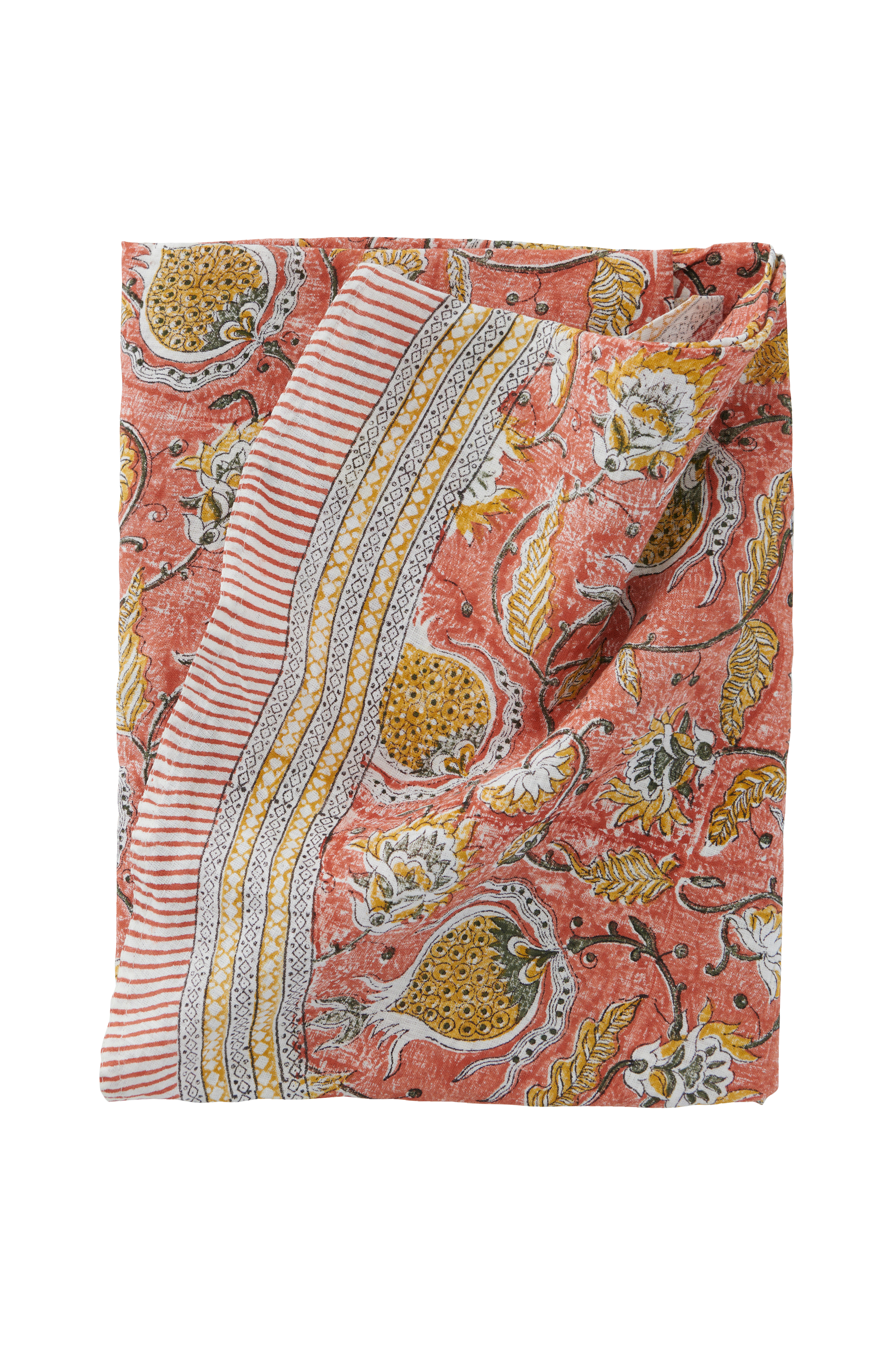 Ylellinen pyöreä pellavapöytäliina, jossa eksoottinen kuvio ja koristeboordi. Kuvio on painettu käsin perinteisellä intialaisella blockprint-tekniikalla. Ainutlaatuinen käsityö antaa pöytäliinalle elävän ja koristeellisen ilmeen.