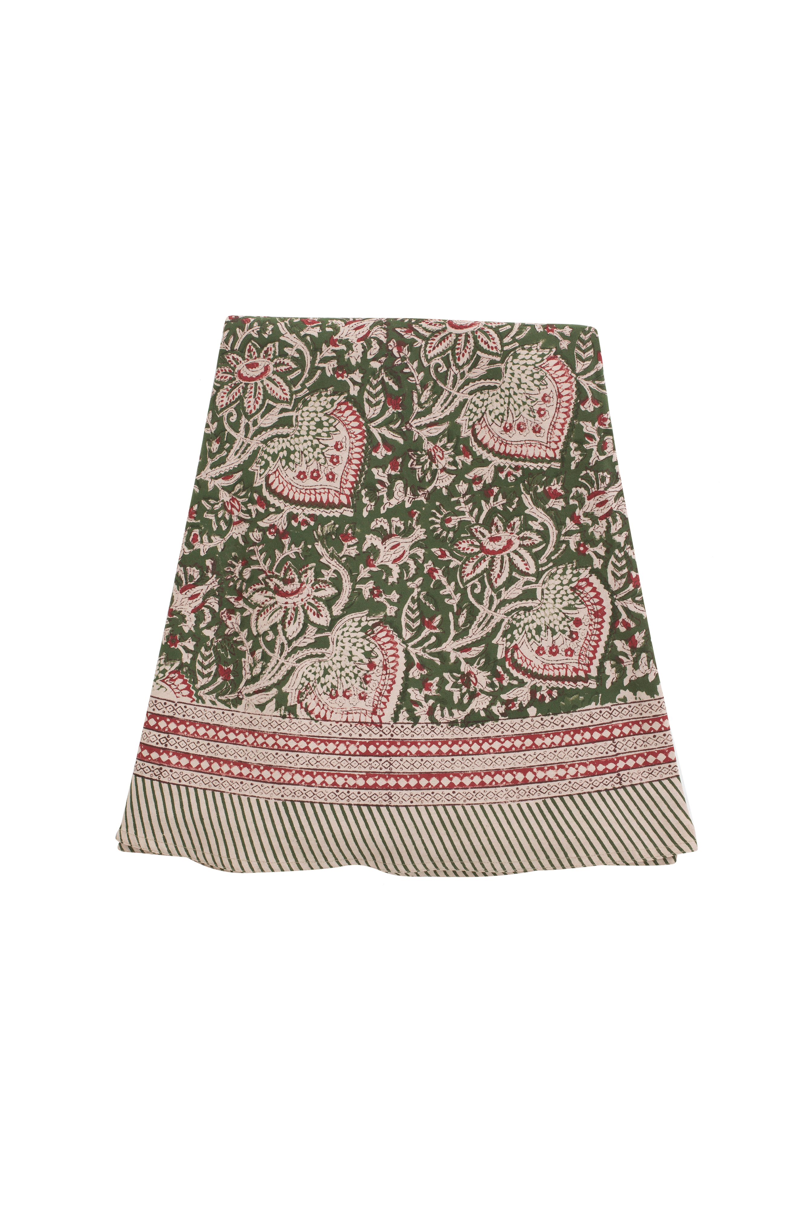 Korkealaatuisesta puuvillasta valmistettu tyylikäs pöytäliina, jossa on kaunis kuvio ja koristeellinen reunus. Kuvio on painettu käsin perinteisellä intialaisella painotekniikalla. Ainutlaatuinen käsityö, joka antaa jokaiselle pöytäliinalle ainutlaatuisen ja koristeellisen ilmeen. Pese pöytäliina lyhyellä (enintään 1 tunti) ja hellävaraisella ohjelmalla villalle/siidalle miedolla pesuaineella.