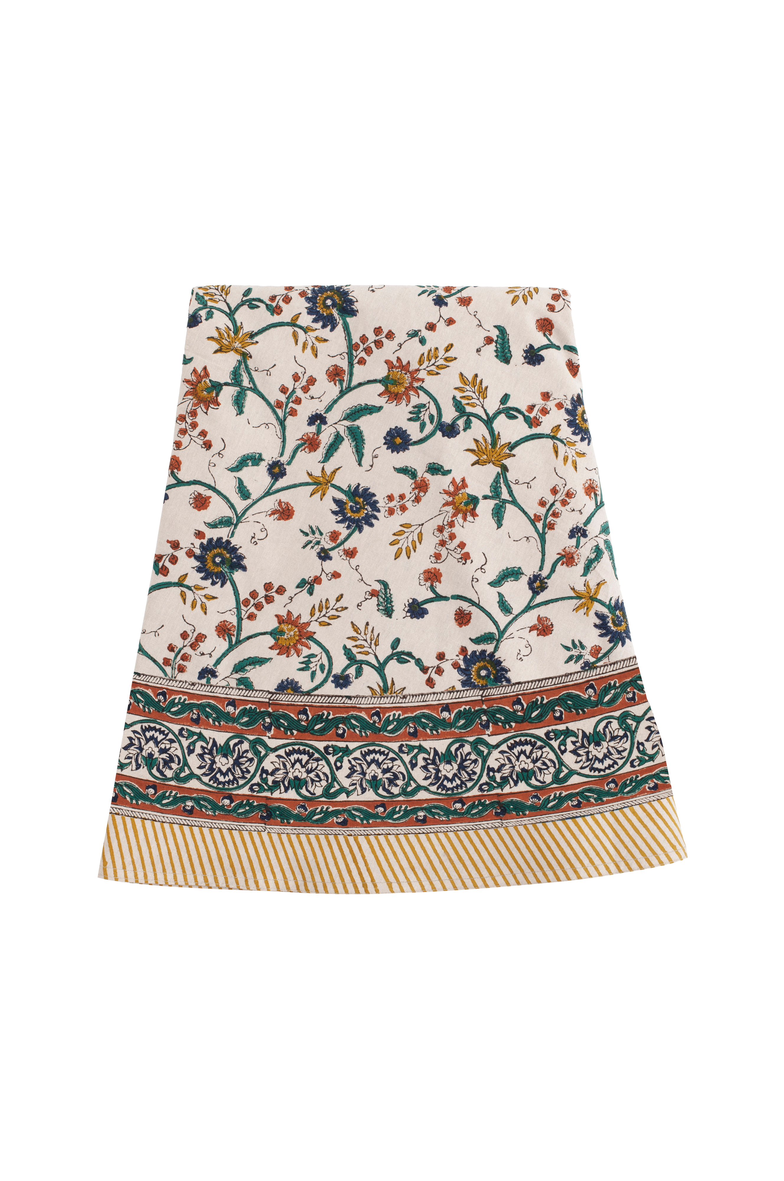 Kaunis pyöreä pöytäliina korkealaatuisesta puuvillasta, jossa on monivärinen kukkakuvio ja koristeellinen reunus. Kuvio on painettu käsin perinteisellä intialaisella painotekniikalla. Ainutlaatuinen käsityö, joka antaa jokaiselle pöytäliinalle ainutlaatuisen ja koristeellisen ilmeen. Pese pöytäliina lyhyellä (enintään 1 tunti) ja hellävaraisella ohjelmalla villalle/siidolle miedolla pesuaineella.