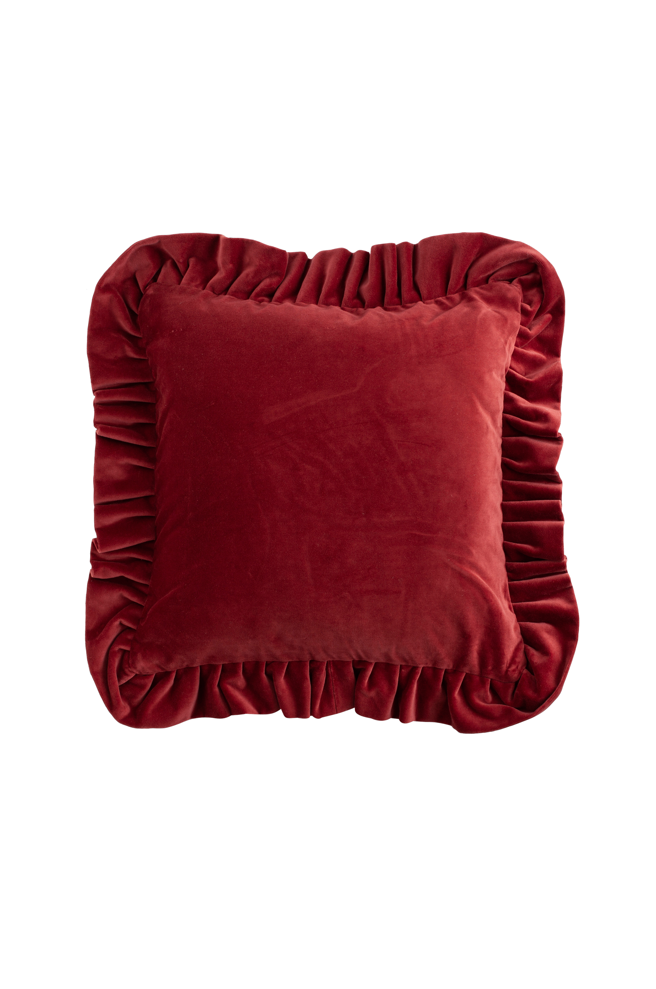Ylellinen tyynynpäällinen, joka on valmistettu raskaasta puuvillasametista ja jossa on runsas ja koristeellinen röyhelö reunalla. 45x45 + 7cm röyhelö