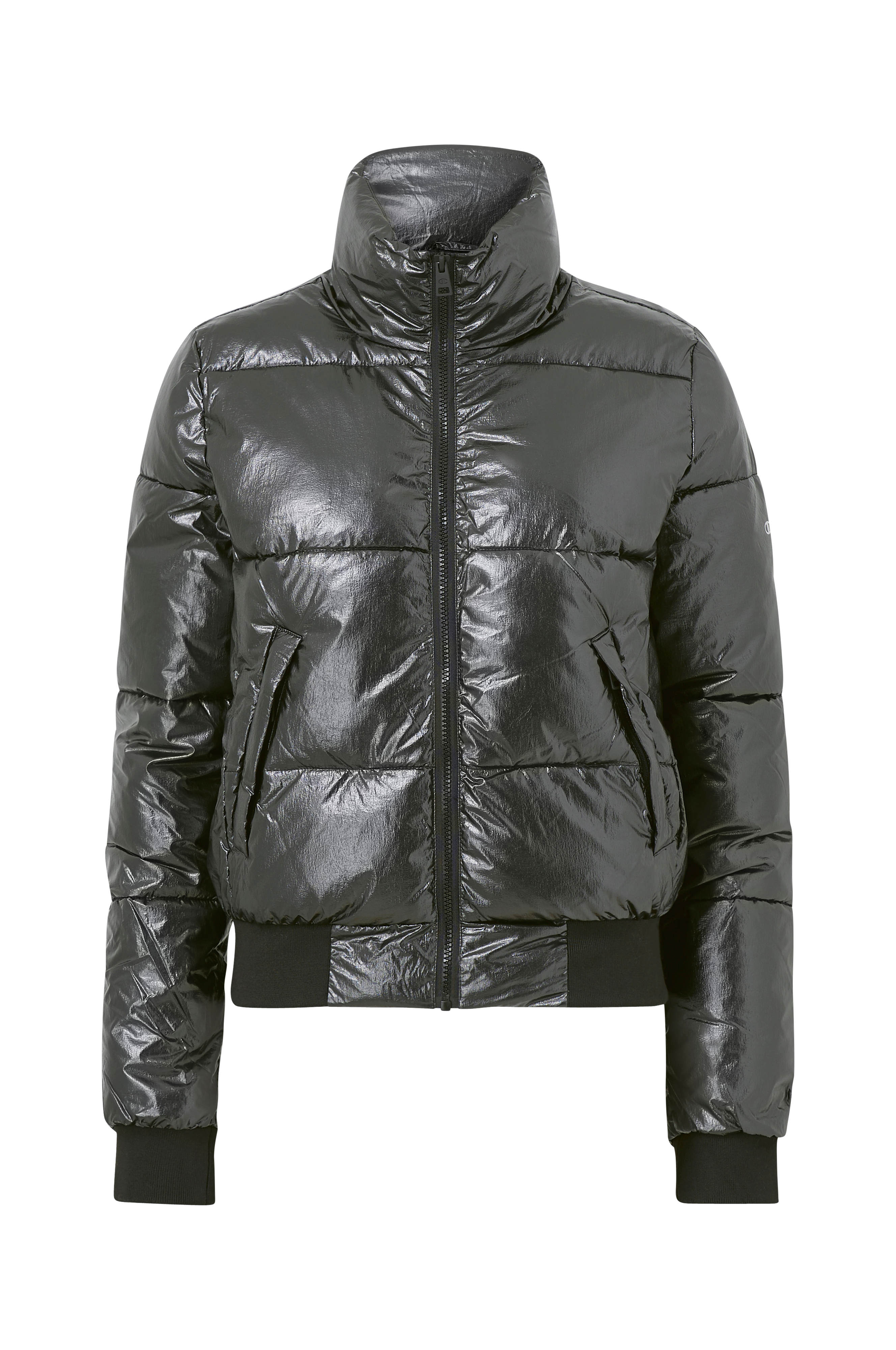 Champion Bomber Jacket -takki. Topattu, untuvamainen malli, jossa tikkaukset. Edessä vetoketju, korkea topattu kaulus ja kaksi upotettua vetoketjutaskua. Resori hihansuissa ja helmassa. Pituus n. 59 cm koossa S.