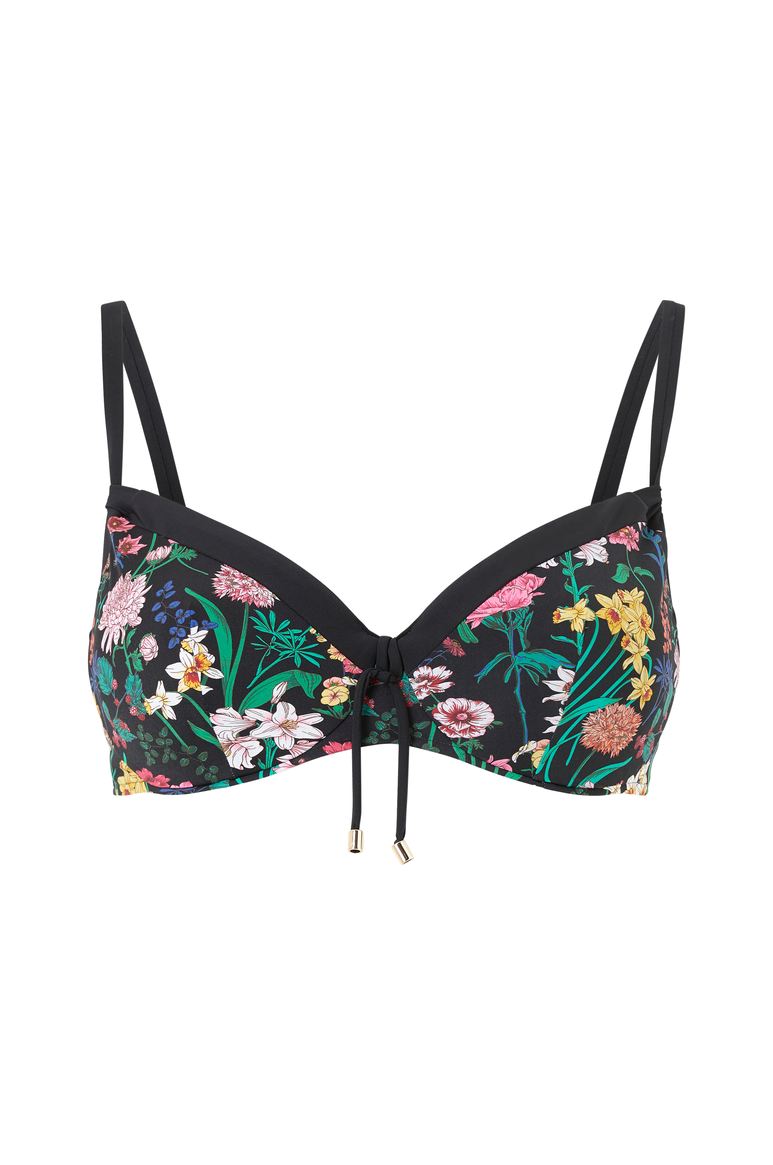 Bikiniyläosa, jossa kaarituet ja kupeissa verkkovuori. Yksivärinen yläreuna ja olkaimet. Kuppien välissä solmittavat nauhat, joissa metallipäät.