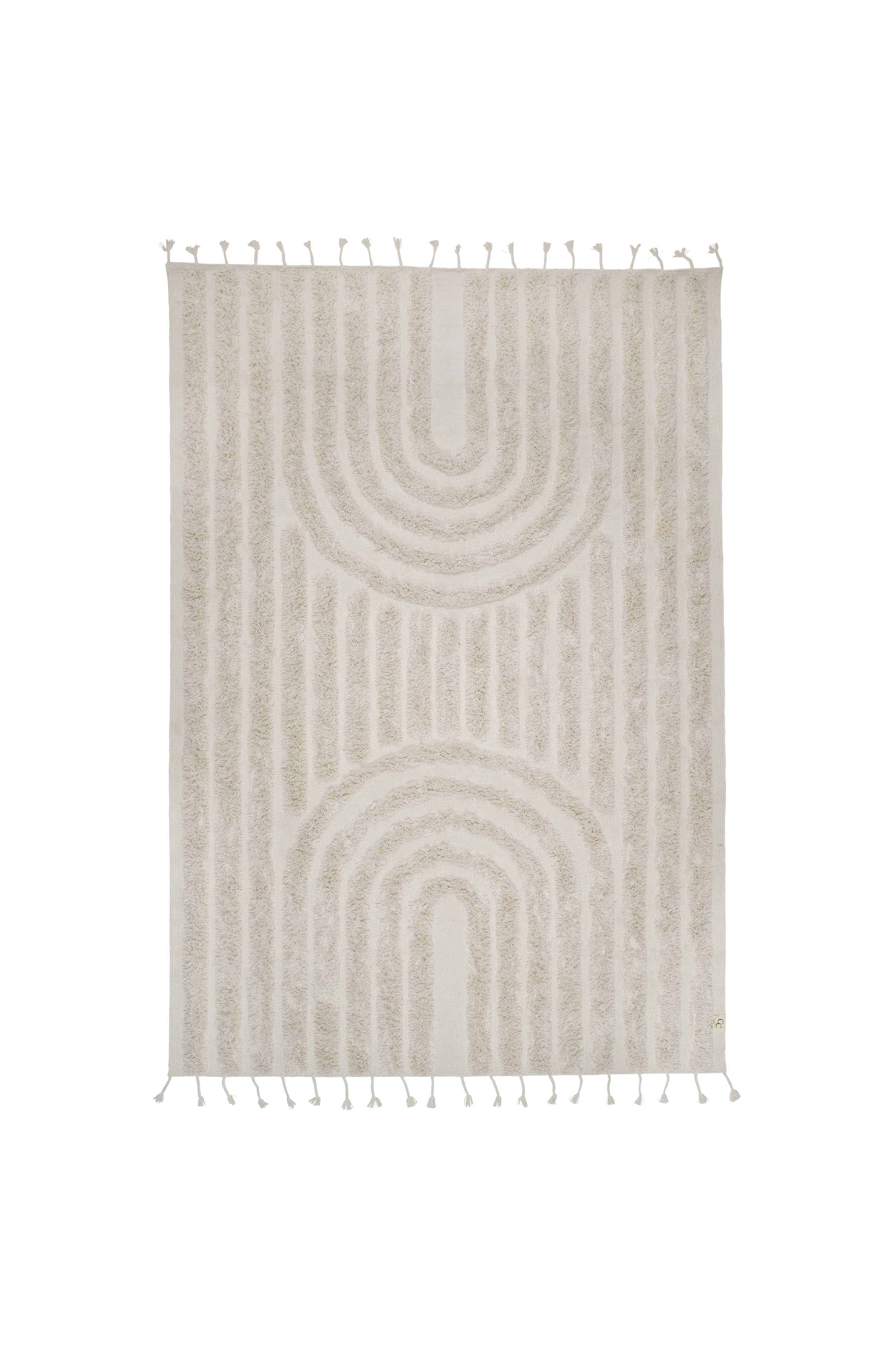 Arch-puuvillamatto on käsinkudottu, ja siinä on korkea ja matala kuvio. Päädyissä hapsut.