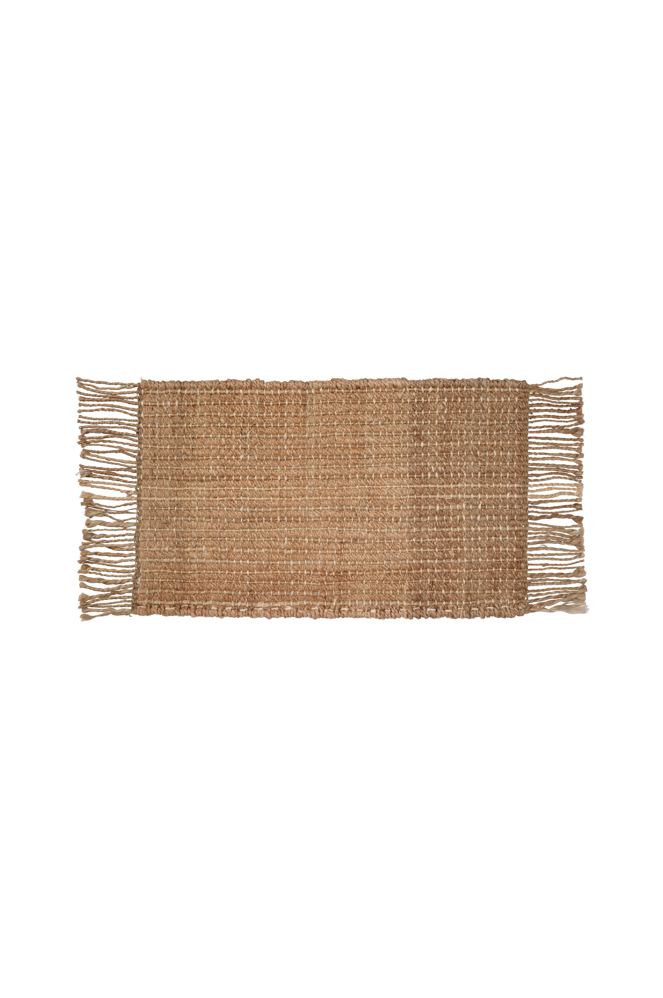 Juutista käsinkudottu ovimatto. Juutti on erittäin kestävä luonnonkuitu. Hapsut lyhyillä sivuilla.