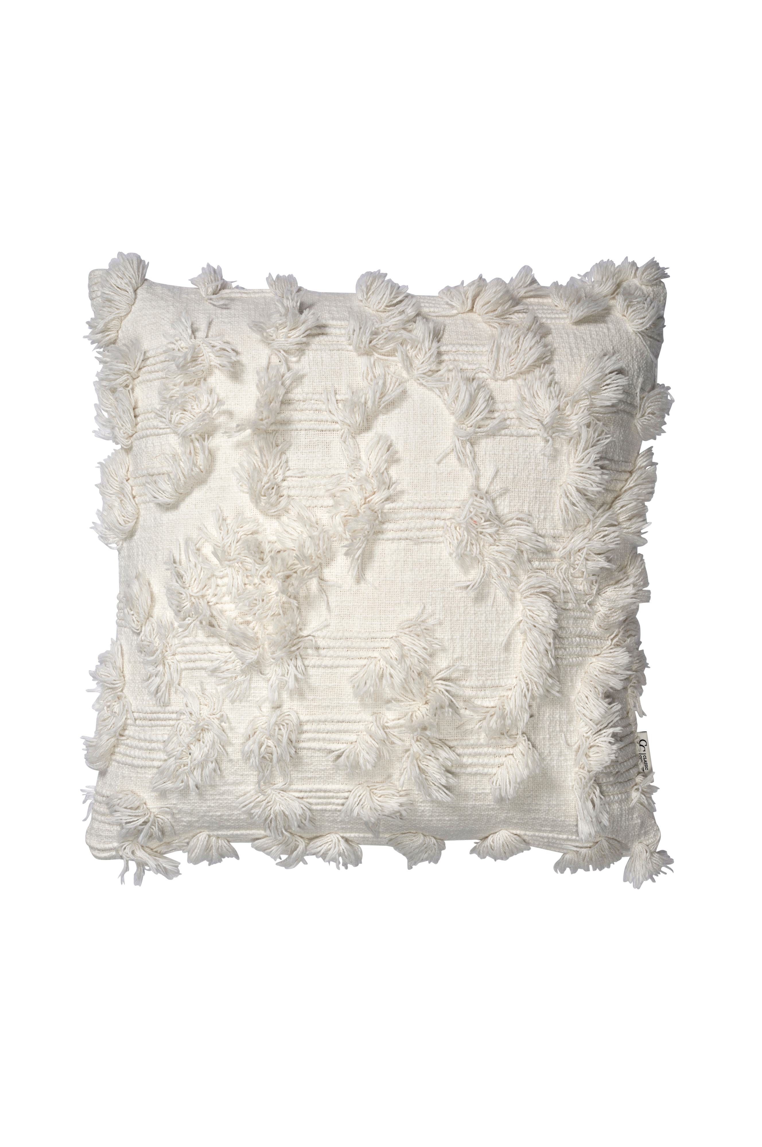 Kauttaaltaan puuvillainen tyynynpäällinen, jossa applikointeja.
