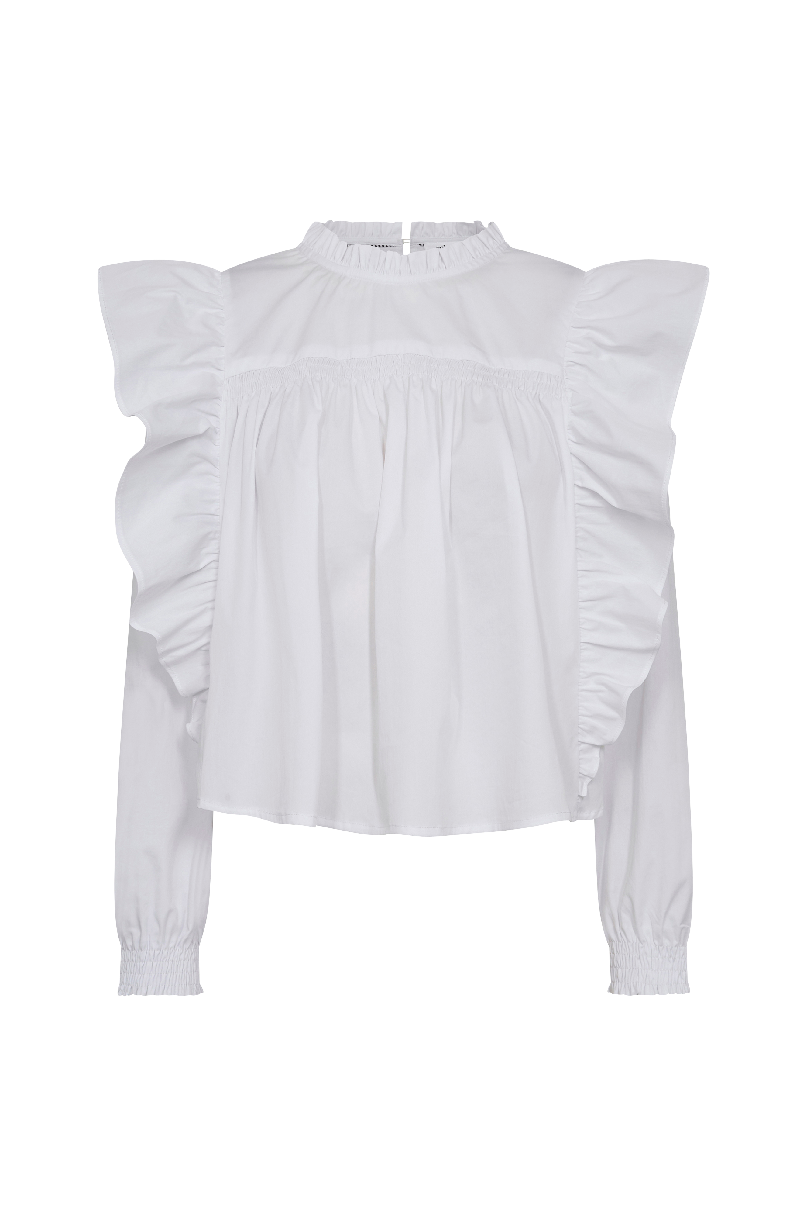 • Leveä malli• Röyhelö sivuilla ja kummallakin olkapäällä• Pieni röyhelöreuna kaulassa• Halkio napilla niskan kohdalla• Poimutettu rypytys rintamuksessa• Pallohihat rypytyksellä hihansuissa