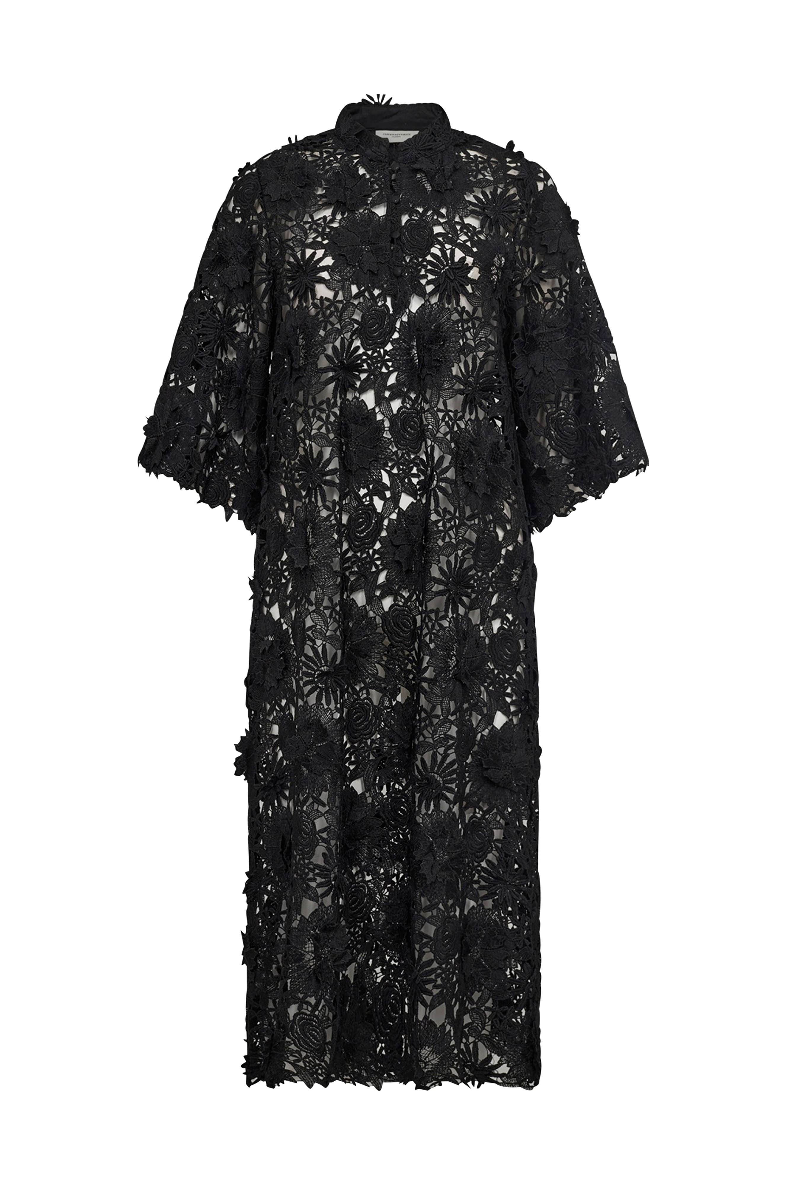 • Pitkä, läpinäkyvä malli pitsistä• Pieni pystykaulus• Lyhyt nappietupuoli silmukkasulkemisella ja päällystetyillä napeilla• Leveä, puolipitkä hiha• Pituus: 124 cm koossa S