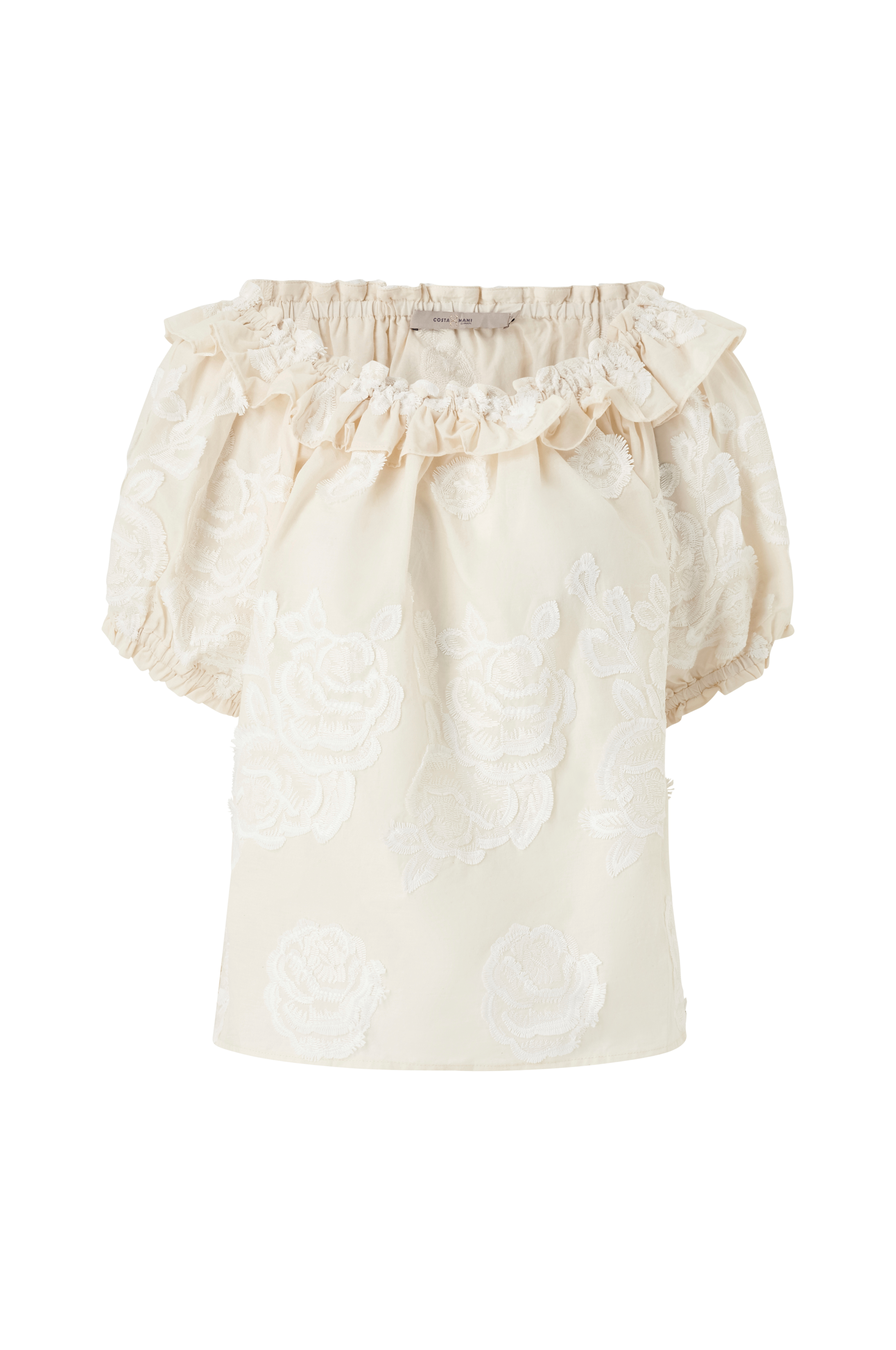 • Off shoulder -pääntie kuminauhalla ja röyhelöreunalla