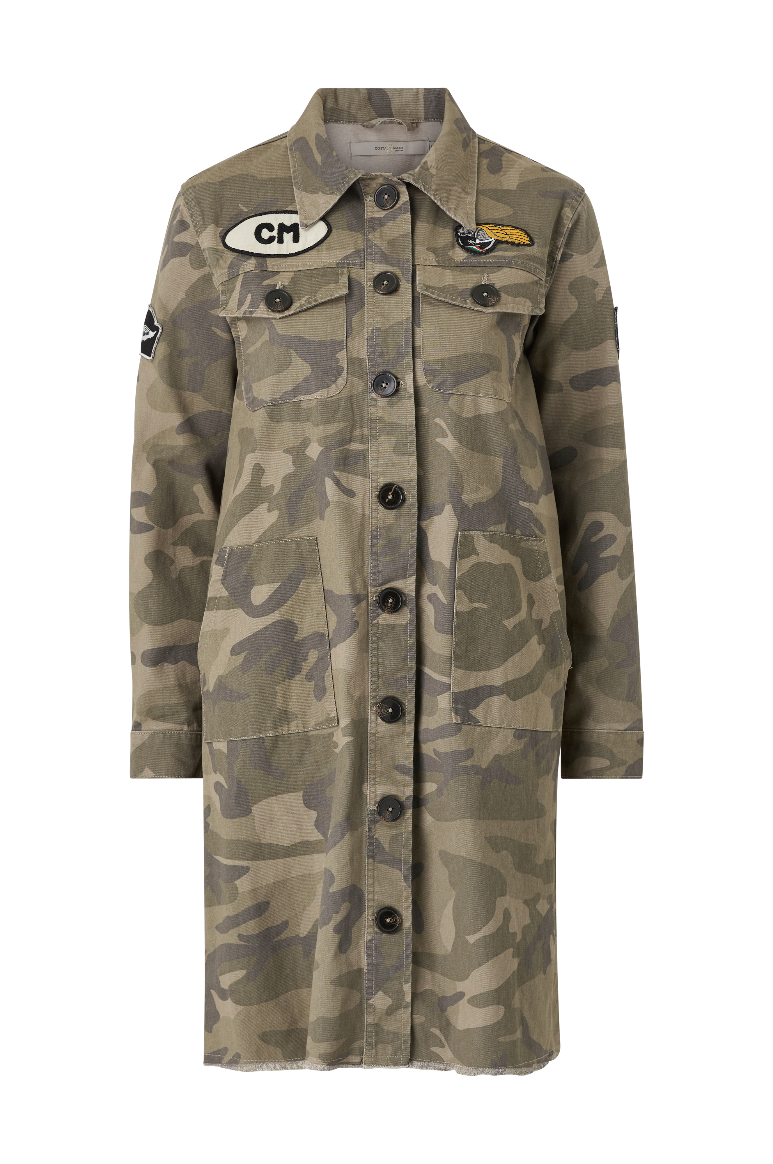 • Pitkä, maastokuviollinen takki kiinniommelluilla merkeillä