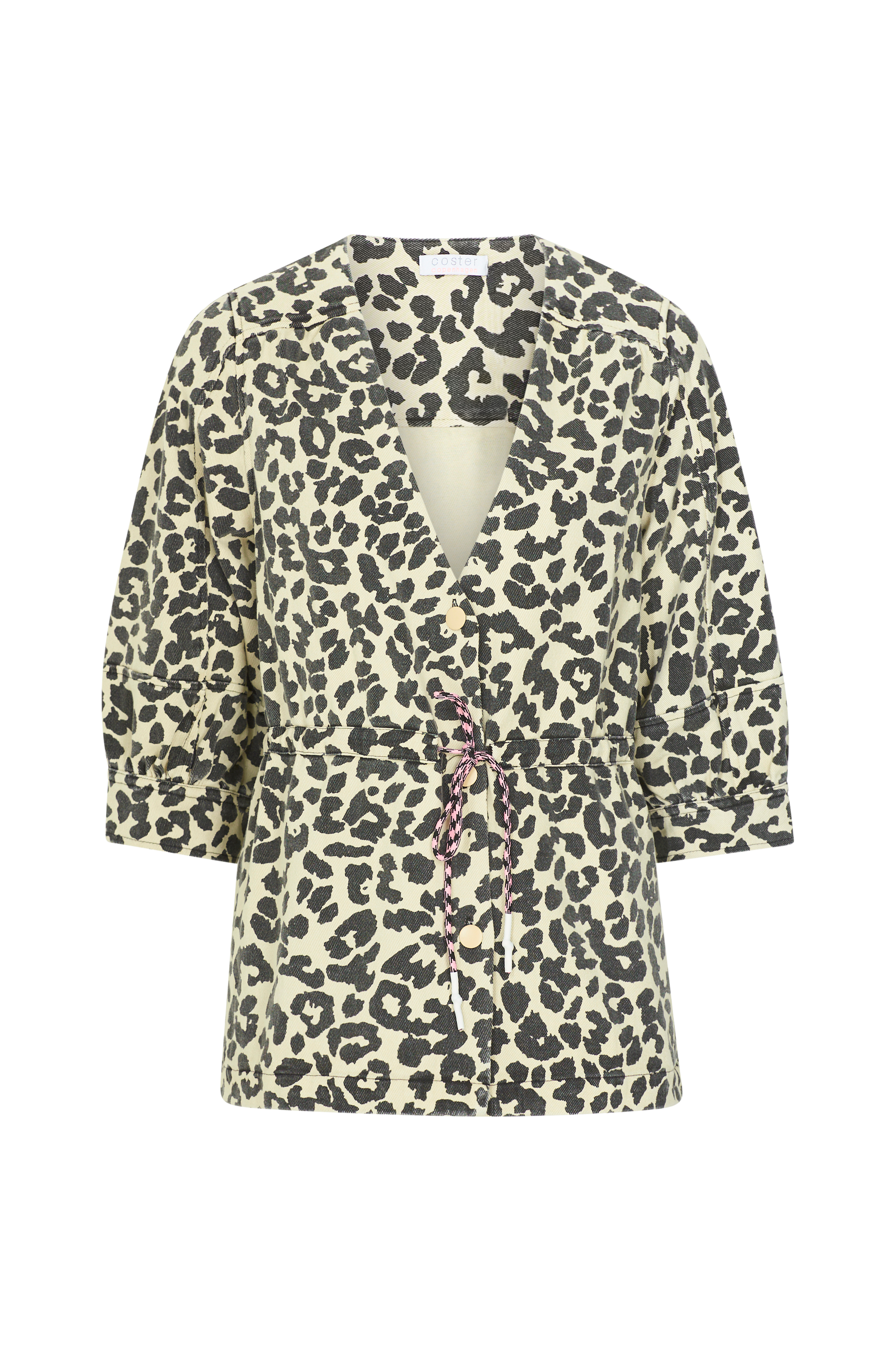 Takissa V-pääntie ja napit edessä. Nyöri vyötäröllä. Sivutaskut. 3/4-pituiset hihat. Pituus n. 70 cm koossa 36.
