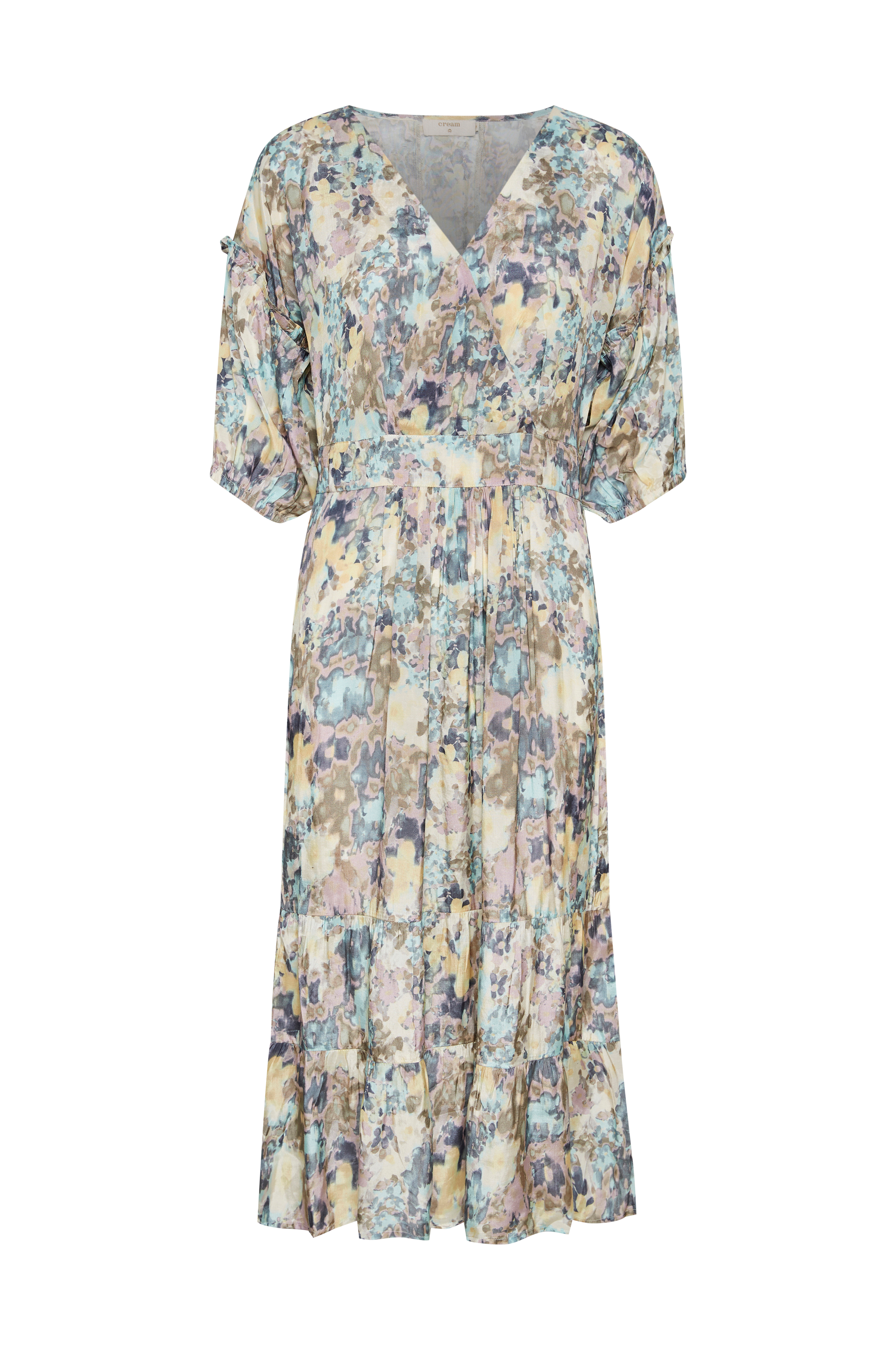 Viskoosimekko. Pohjepituinen malli, jossa V-pääntie edessä. Puolipitkissä puhvihihoissa madallettu olkasauma ja hihansuissa kuminauha. Korostettu vyötärö, jossa poimutukset edessä ja leveä smokkirypytys takana. Levenevä hameosa, jossa röyhelö. Pituus n. 119 cm koossa 36.