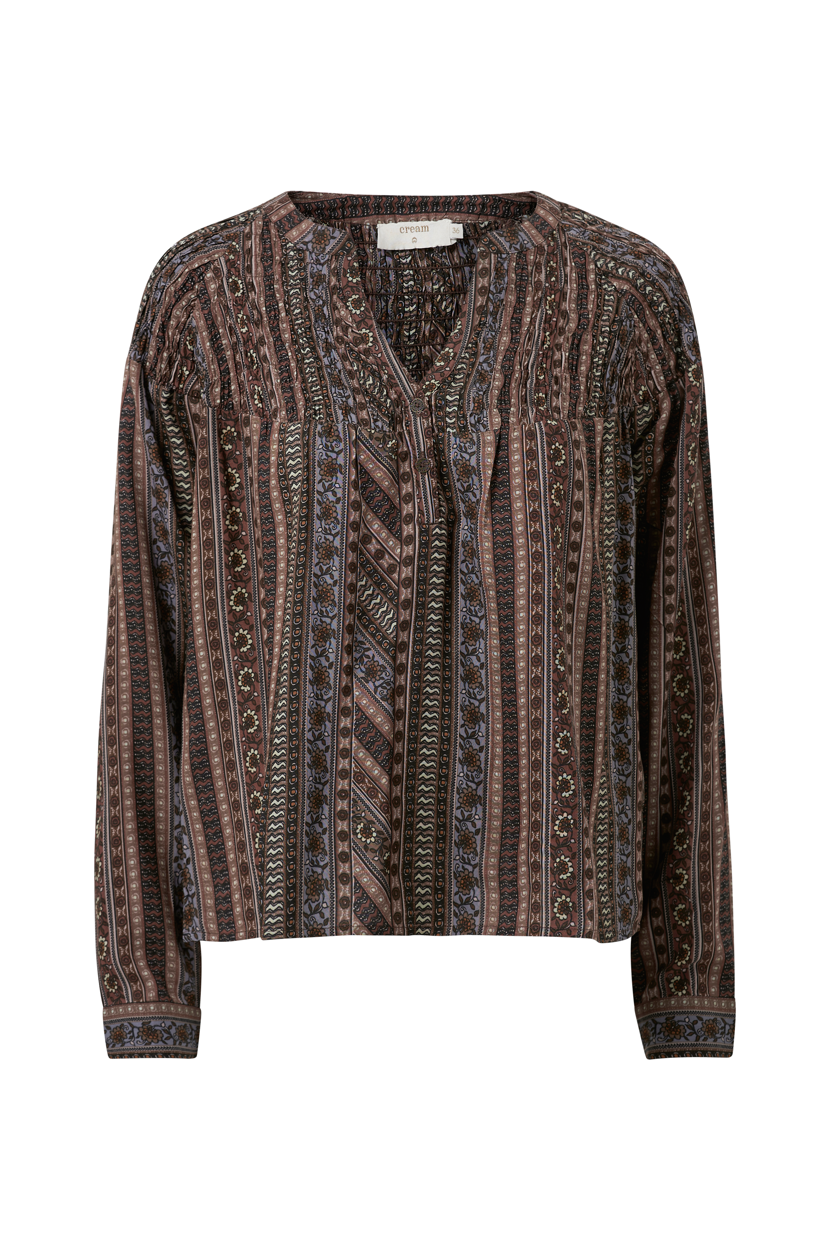Cream FiorellaCR Blouse -paita, jossa V-pääntie ja napit ylhäällä edessä. Smokkirypytys edessä, takana ja hihoissa. Hihansuissa kalvosin ja nappi.