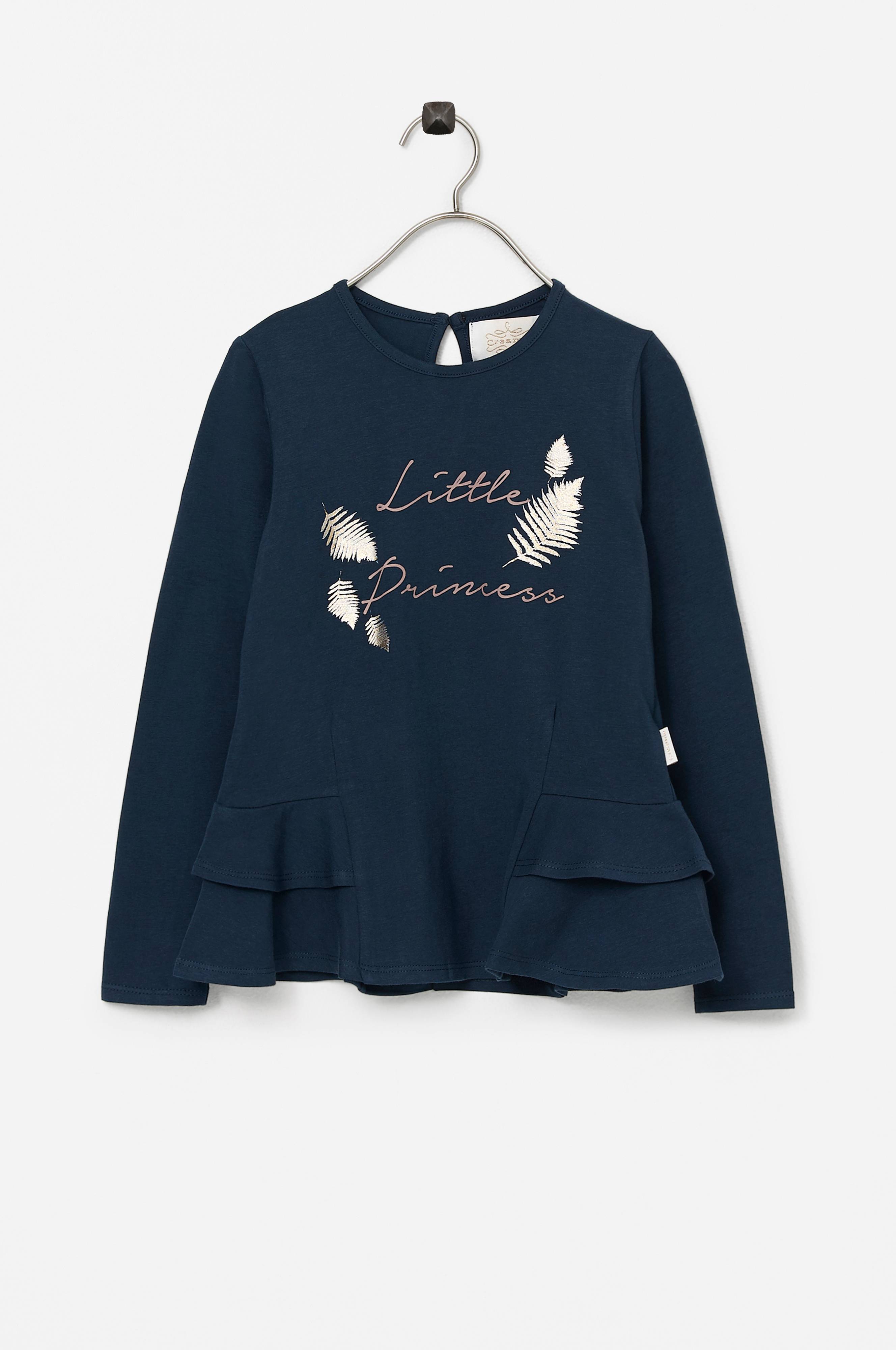 Creamie Leaf LS -pusero pehmeää, joustavaa puuvillatrikoota. Pyöreä pääntie, jossa halkio ja nappi takana. Kullanhohtoinen painatus edessä ja röyhelöyksityiskohta helmassa.