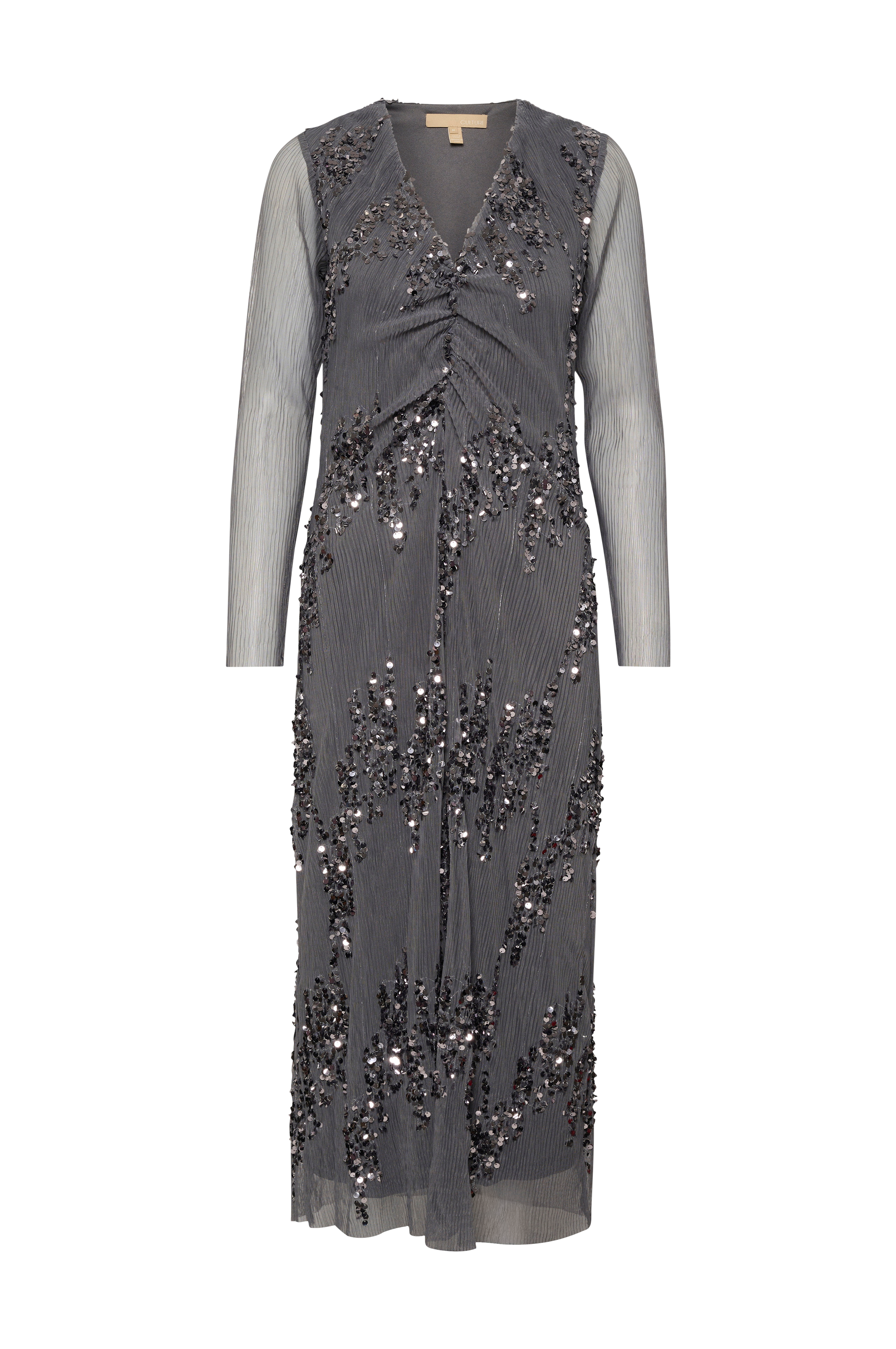 • Tyköistuva, laskostettu malli kirjailluilla paljeteilla