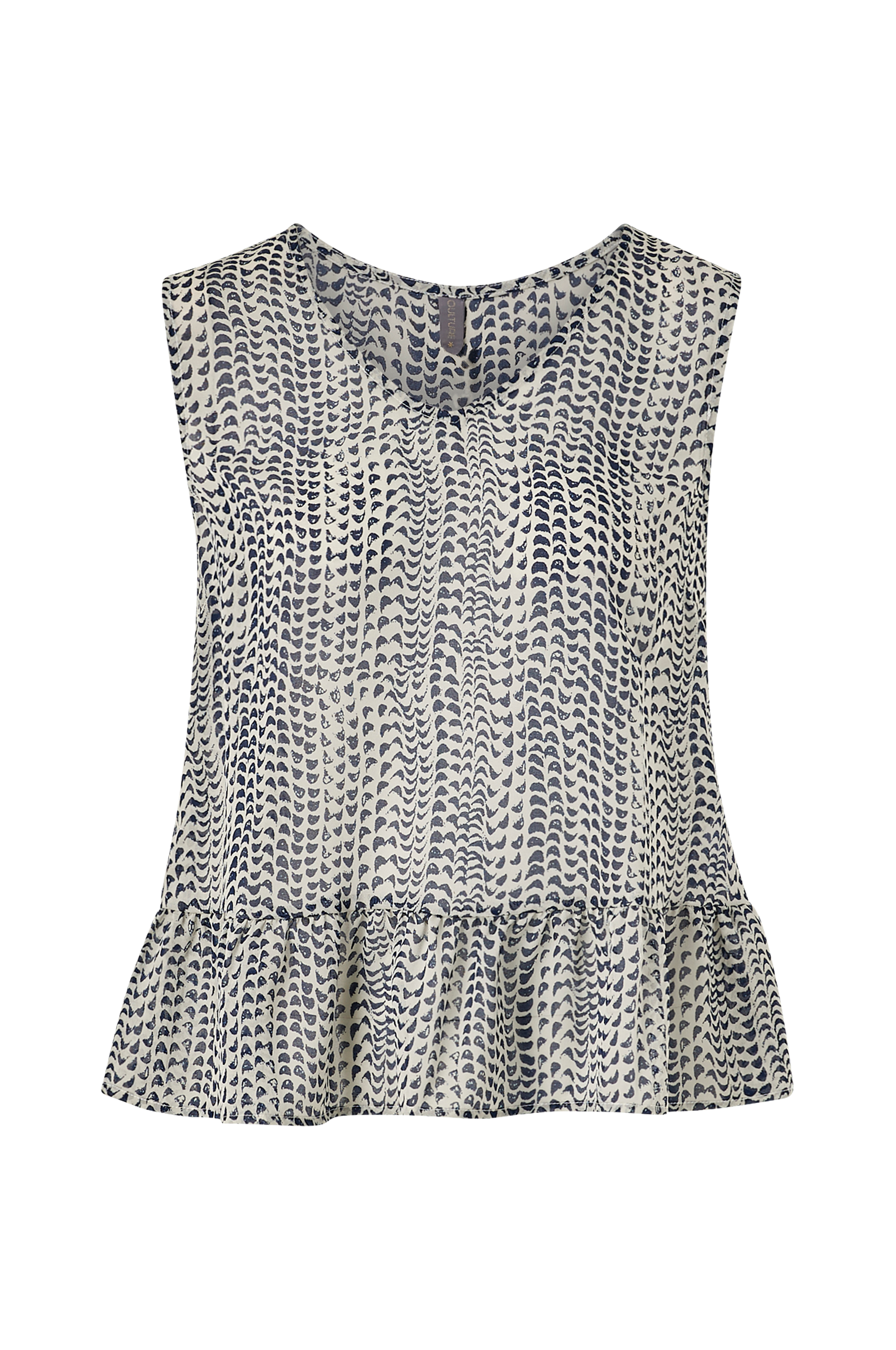 Culture cuMoon Top -paita hieman läpikuultavaa, kuviollista materiaalia. V-pääntie edessä ja röyhelö helmassa.