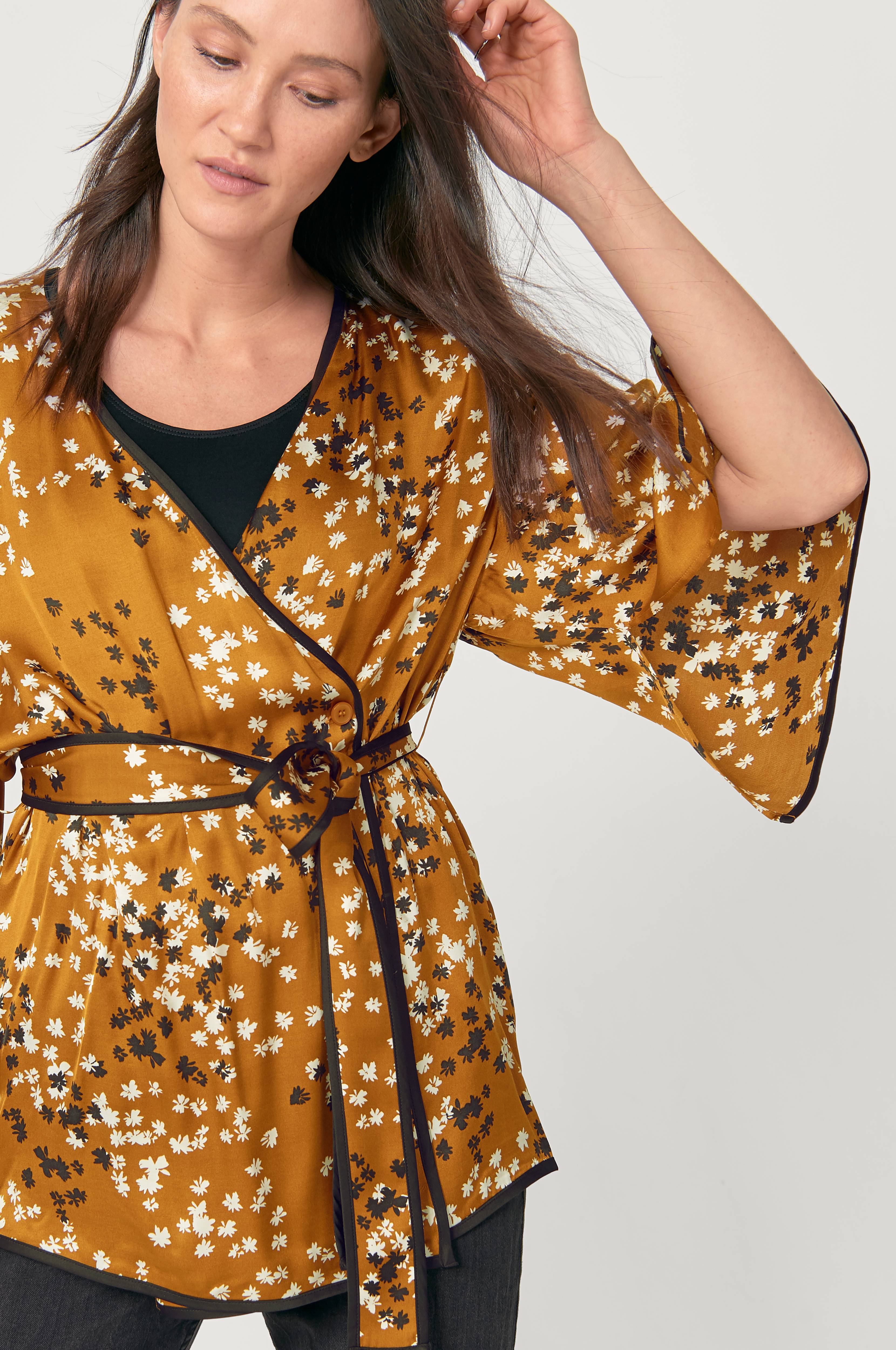 Dagmar Alanis -kietaisupaita. Rento, pitkähkö kimonomalli ja leveät, 3/4-pituiset hihat, joissa halkio. Leveä solmimisnauha vyötäröllä. Kaksirivinapitus edessä.
