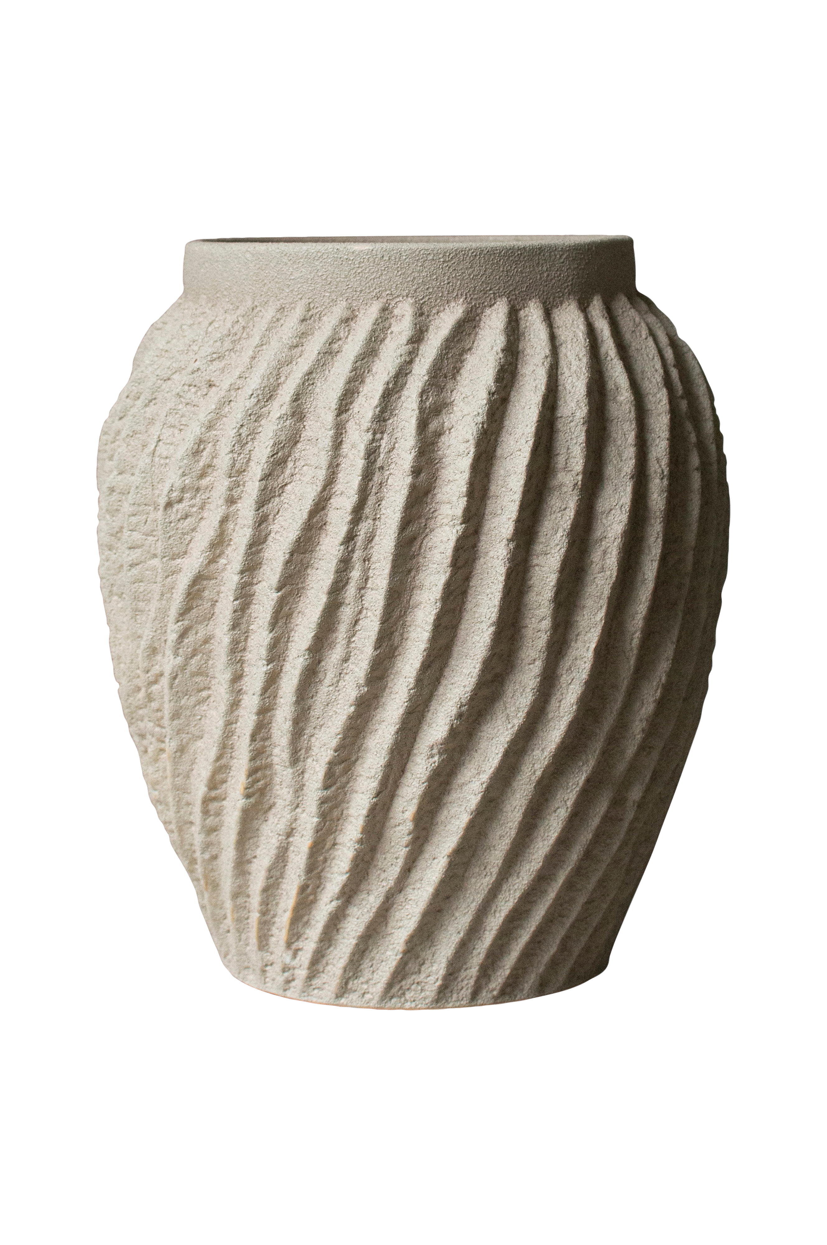 Käsin kaiverrettu ruukku/maljakko keramiikkaa, jossa rouhea, hiekkamainen pinta. Halkaisija 17 cm, korkeus 29 cm.