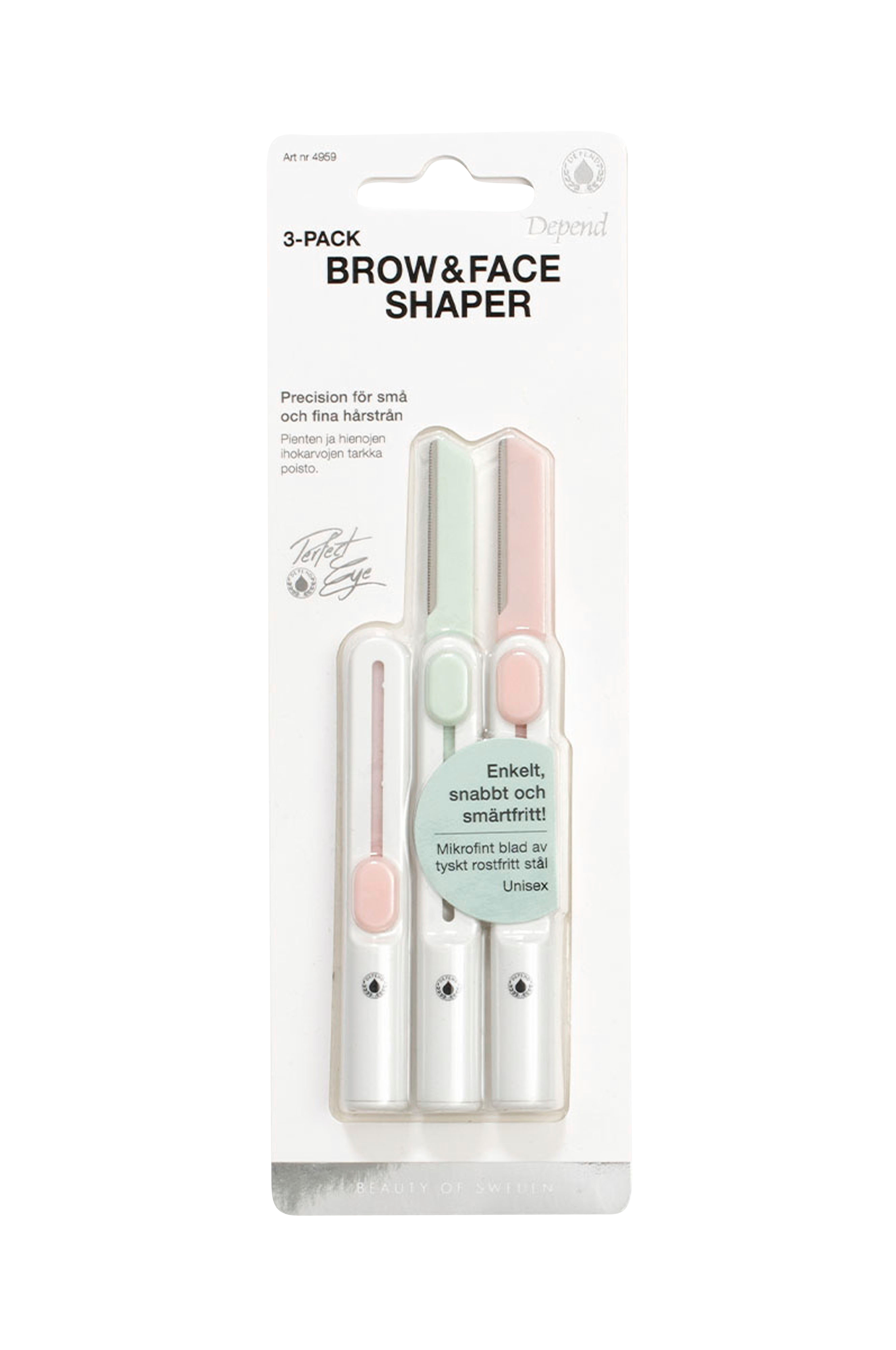Depend Brow & Face Shaper on työkalu kaikille, jotka haluavat poistaa ei-toivotun karvoituksen nopeasti ja turvallisesti. Laadukkaasta saksalaisesta ruostumattomasta teräksestä valmistettu mikrohieno sisäänvedettävä terä voidaan asettaa kahteen asentoon optimaalista tarkkuutta varten. Muotoile kulmakarvat täydellisiksi ja huomaa, kuinka helppoa on poistaa pienet ja lyhyet karvat sekä hienot velluskarvat kasvoilta, kaulalta ja muilta kehon osilta.