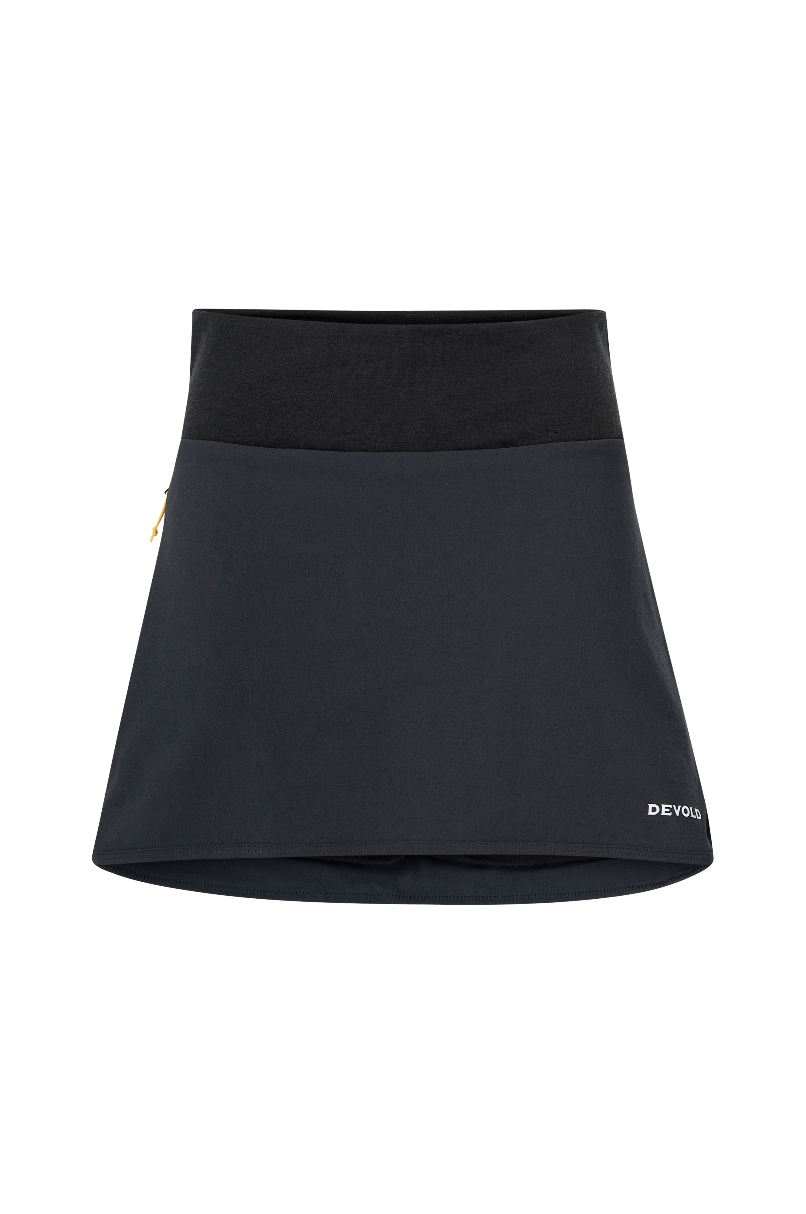 Tuulta hylkivä ja joustava juoksuhame, jossa tiukat sisäshortsit. Joustava hame ja shortsit antavat optimaalisen liikkumavapauden. Leveä vyötärönauha ja pieni sivutasku.