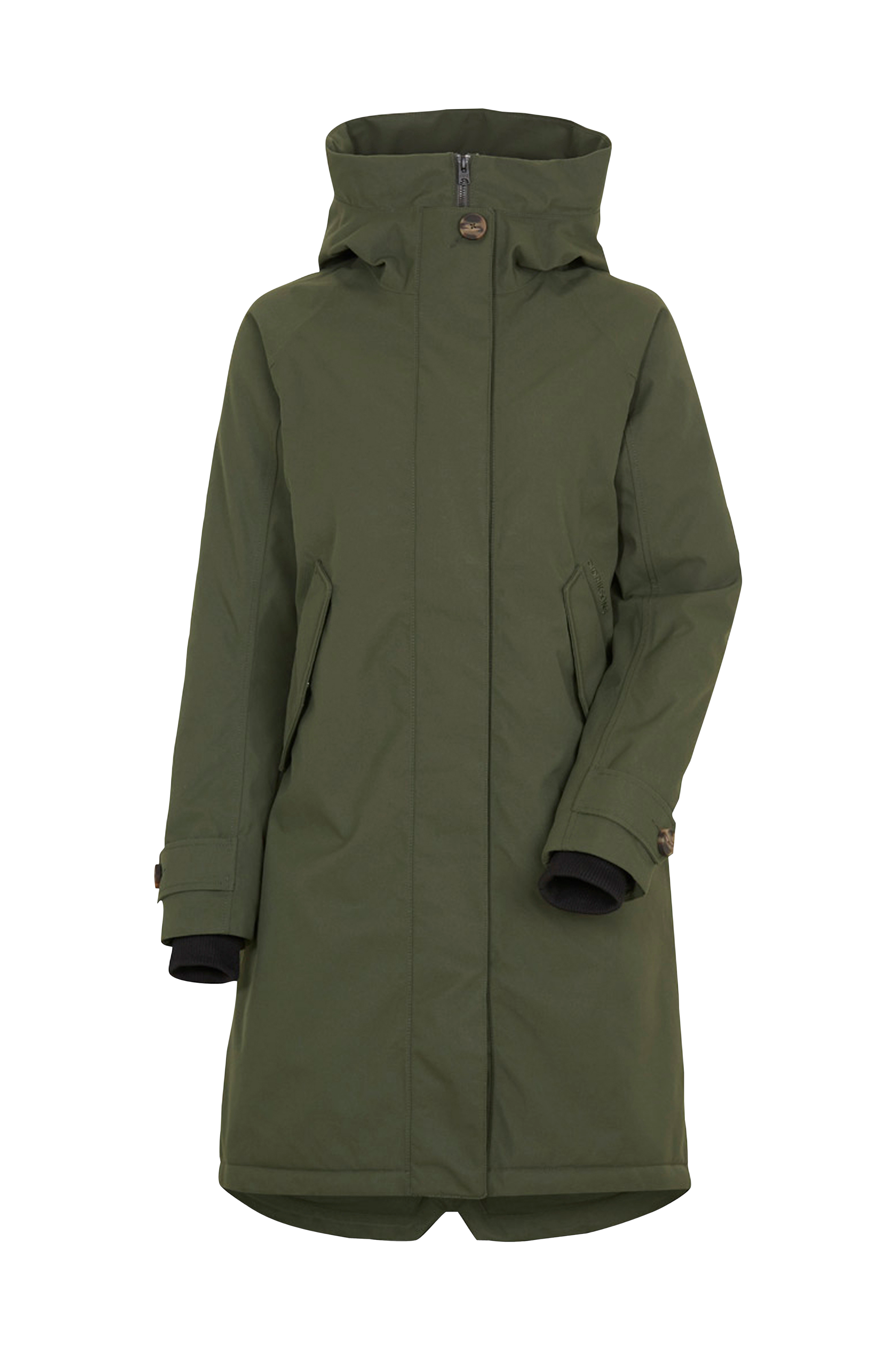 Pitkä, topattu parkatakki, joka on tuulen- ja vedenpitävä. Teipatut saumat ja hyvä hengittävyys. A-linjainen, takaa hieman pidempi malli. Pehmeää, mattapintaista polyesteritvilliä.