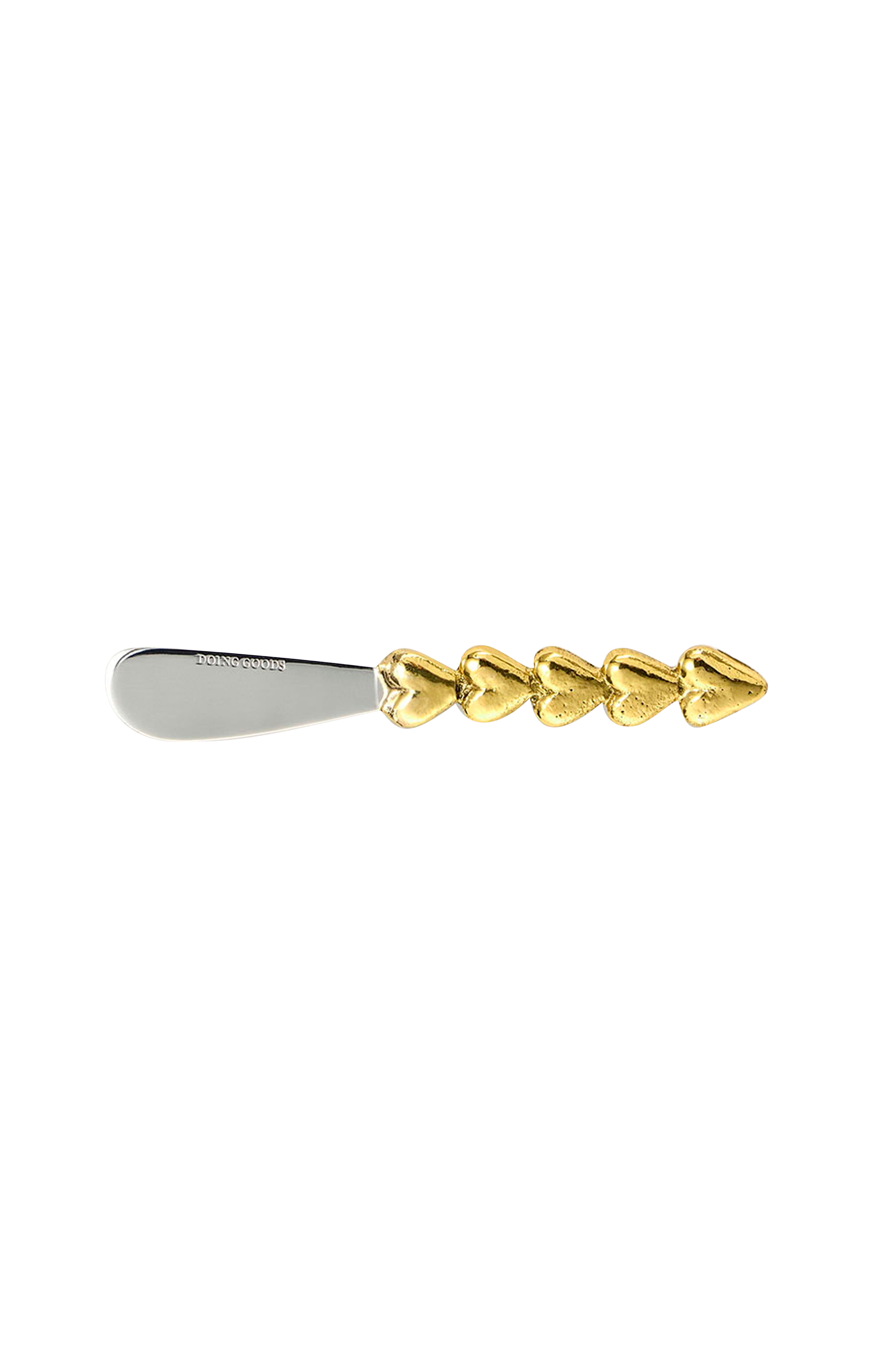 Tuo rakkautta ja eleganssia pöytääsi Holly Heart -voiveitsellä. Tämä erityinen veitsi on valmistettu käsin messingistä ja korkealaatuisesta ruostumattomasta teräksestä. Kahva on kauniisti koristeltu rivillä pieniä sydämiä lämpimällä kultaisella viimeistelyllä - hienovarainen yksityiskohta, joka tekee jokaisesta ateriasta hieman erityisemmän. Voiveitsellä siirretään pehmeää voita tai levitteitä astiasta lautaselle tai leivälle. Pyöristetty kärki mahdollistaa siistin kaapimisen ja levittämisen ilman leikkaamista. Tämä tekee siitä sekä käytännöllisen että tyylikkään aamiaisella, brunssilla tai illallisella. Käytön jälkeen pyyhi se vain kostealla liinalla. Huomaa: tämä voiveitsi ei kestä konepesua. Pese vain käsin, jotta kaunis viimeistely säilyy. Holly Heart -voiveitsi toimitetaan kauniilla lahjakortilla, mikä tekee siitä ihanteellisen lahjan syntymäpäiville, tupaantuliaisiin tai juhlaan. Yhdistä se pieneen juustolautaseen ja gourmet-voihin tai tapenadeen, niin saat täydellisen ja ikimuistoisen lahjan.
