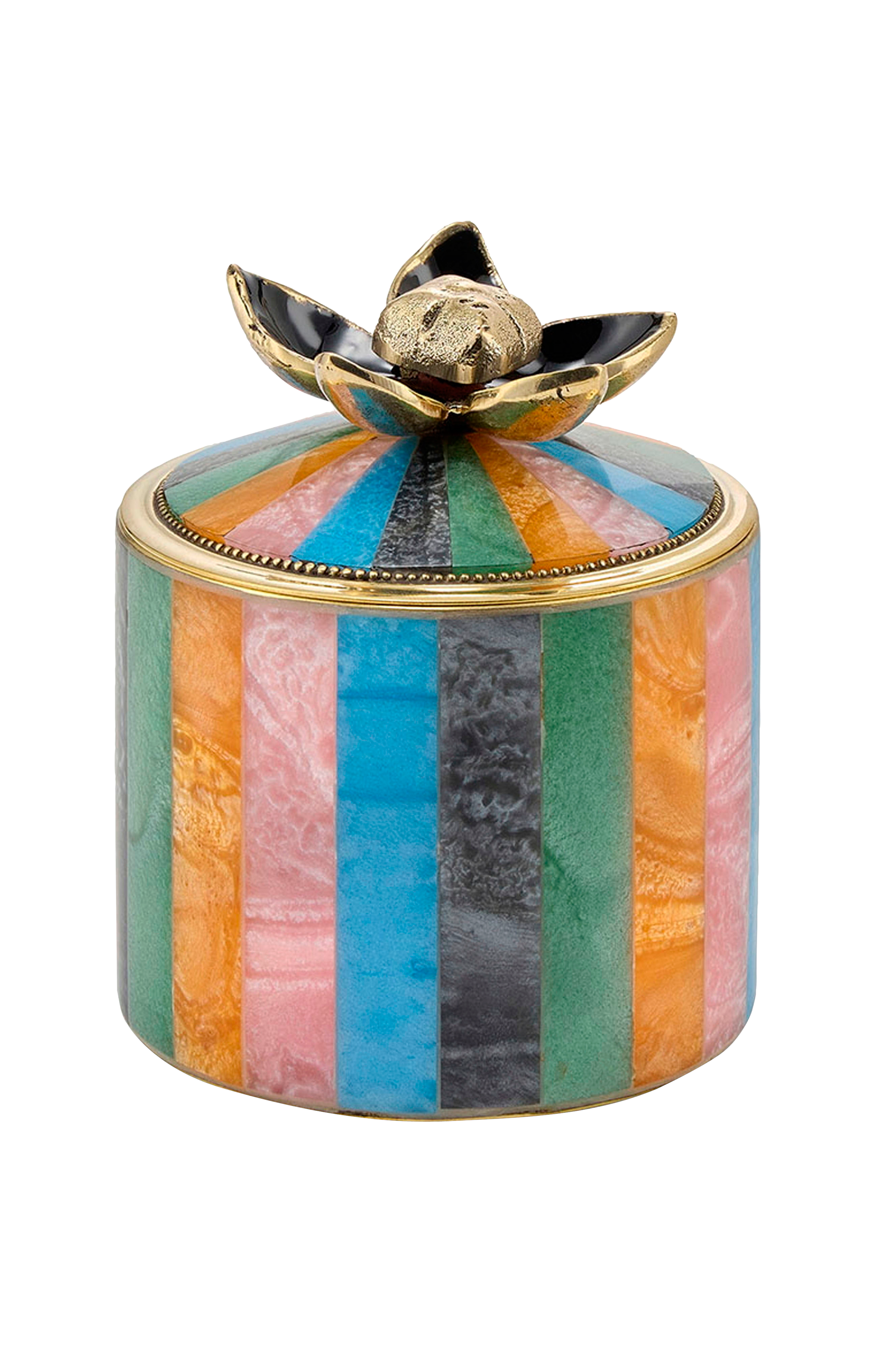 Lisää sisustukseesi ripaus eloisuutta Liv Circus Box Large Multi -laatikolla. Tämä upea säilytyslaatikko on valmistettu käsityönä 60 % messingistä ja 40 % hartsista. Sen värikäs raidallinen muotoilu ja rohkea kukkakuvioinen kansi tekevät siitä sekä koristeellisen että käytännöllisen - todellisen katseenvangitsijan hyllylle, lipastolle tai työpöydälle. Haluatpa sitten säilyttää koruja, pikkuesineitä tai pieniä muistoesineitä, tämä suuri koristeellinen laatikko on täydellinen ratkaisu. Monivärinen viimeistely yhdistää rikkaat sinisen, vihreän, vaaleanpunaisen, keltaisen ja mustan sävyt leikkisissä pystysuorissa raidoissa, jotka tuovat eloa mihin tahansa huoneeseen. Kannen käsin valettu kukka toimii veistoksellisena kahvana, joka lisää sekä eleganssia että leikkisyyttä. Käytä Liv Circus Boxia korurasiana, muistoesineiden säilytysastiana tai pienten henkilökohtaisten aarteiden säilytyspaikkana. Se sopii erityisen hyvin makuuhuoneisiin, kylpyhuoneisiin tai olohuoneisiin, joissa haluat pitää tavarasi järjestyksessä mutta kauniisti esillä. Huomautus: Tämä tuote ei ole elintarviketurvallinen, eikä sitä tule käyttää elintarvikkeiden säilytykseen. Jokainen laatikko on valmistettu käsin Intiassa, mikä takaa, että jokaisella kappaleella on omat ainutlaatuiset vaihtelut ja käsityöläisen viehätys. Kierrätetyn messingin ja hartsin yhdistelmä tekee siitä kestävän ja tyylikkään lisäyksen kodin sisustukseen.