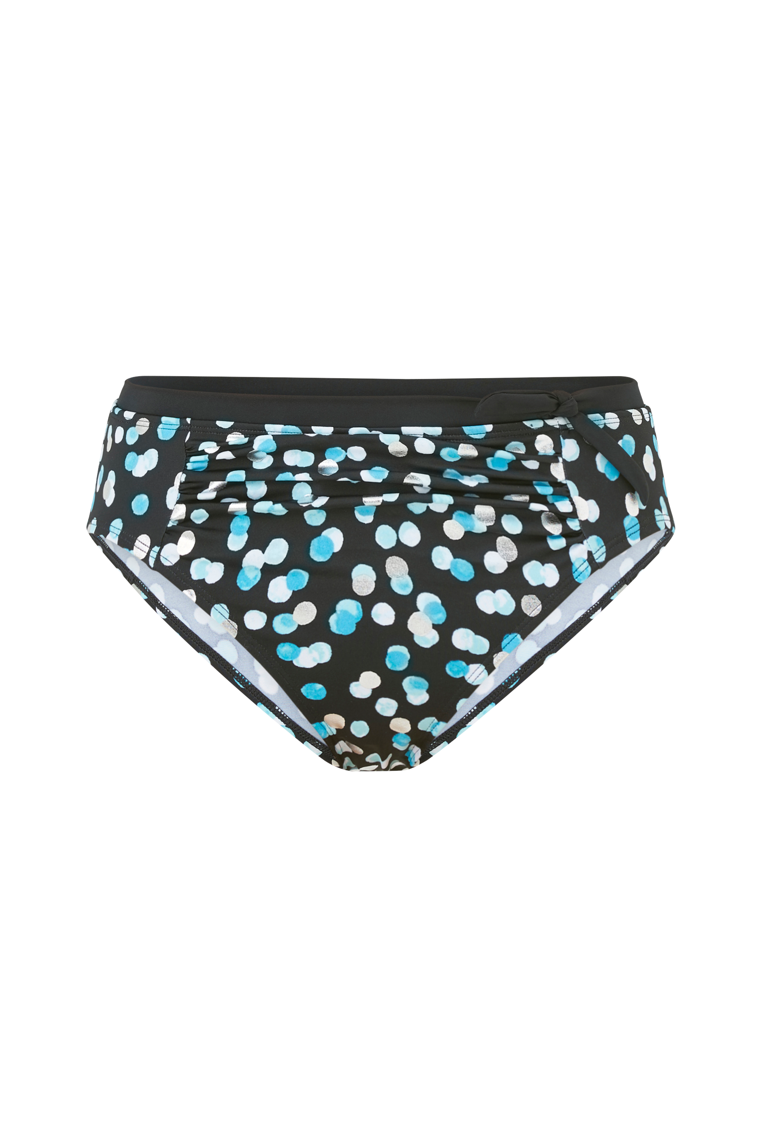 Hipsterimalliset bikinihousut, joissa rypytetty poimutus edessä ja solmittavat nauhat toisella sivulla. Verkkokangasvuori edessä.