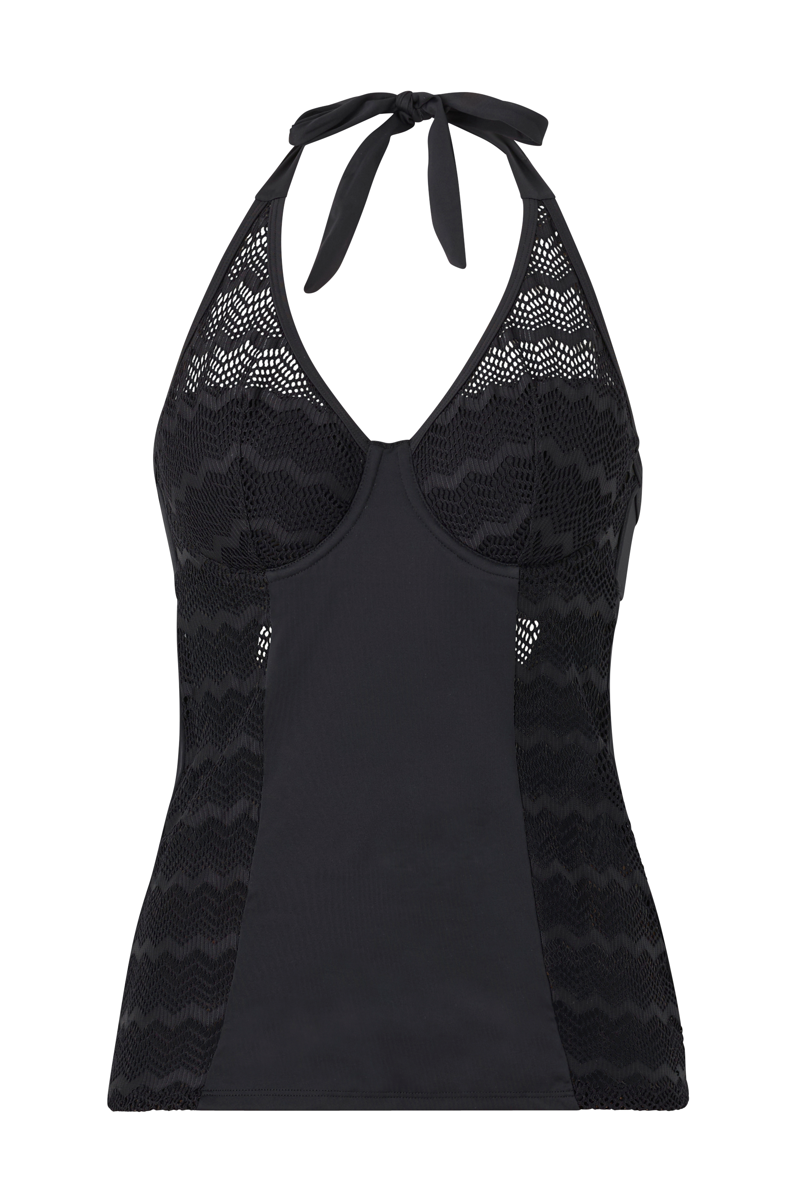 • Halterneck-malli• Kupit kaarituella ja ohuella toppauksella• Muovisolki selässä• Paneloinnit reikäkuvioinnilla sivuilla