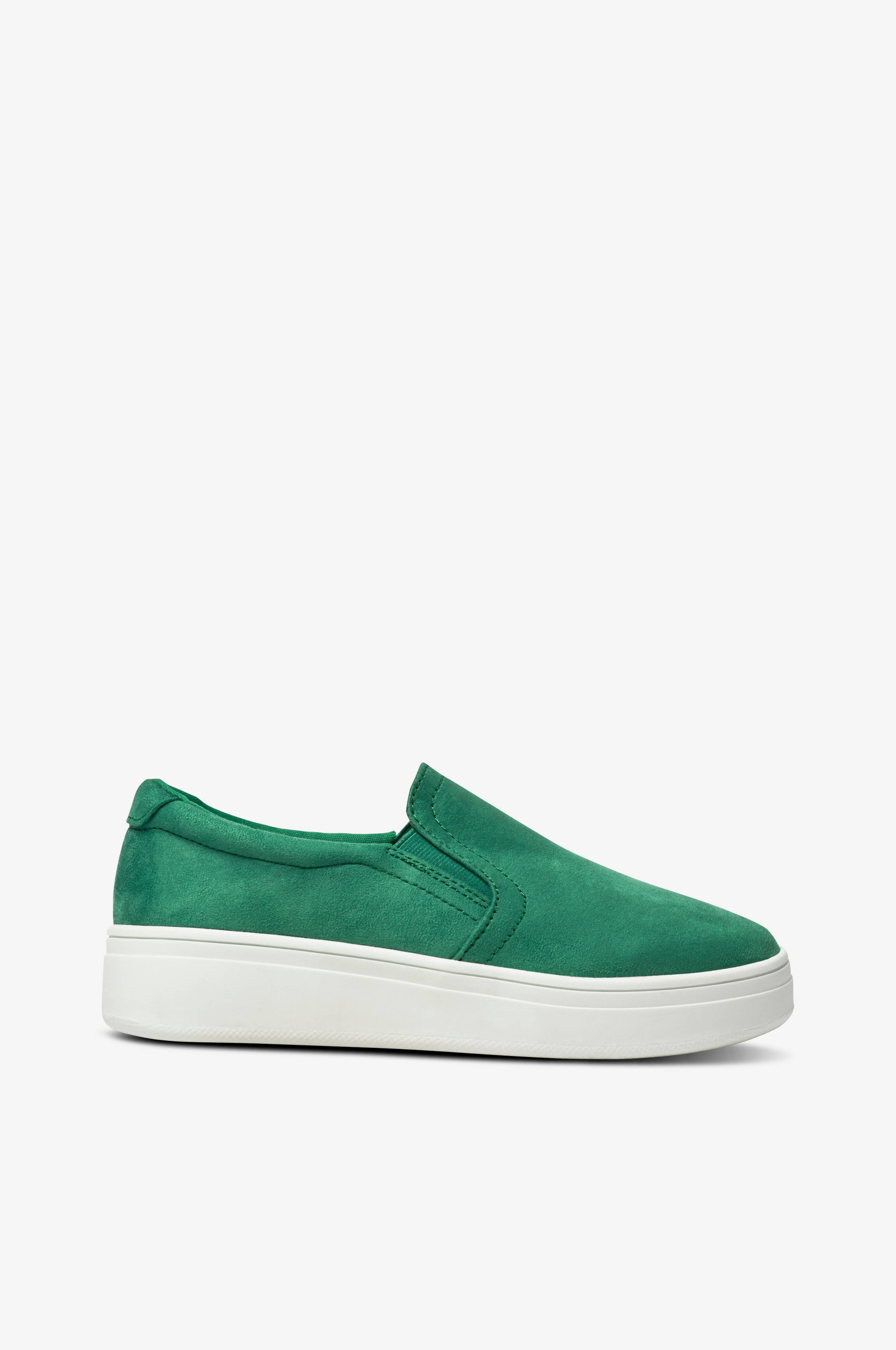 Slip on -malli mokkajäljitelmää. Venykkeet sivuilla. Pehmustettu aukon reuna ja korkea pohjan reuna. Pehmustettu sisäpohja.Koron korkeus n. 4 cm. Pohjan korkeus n. 3 cm.