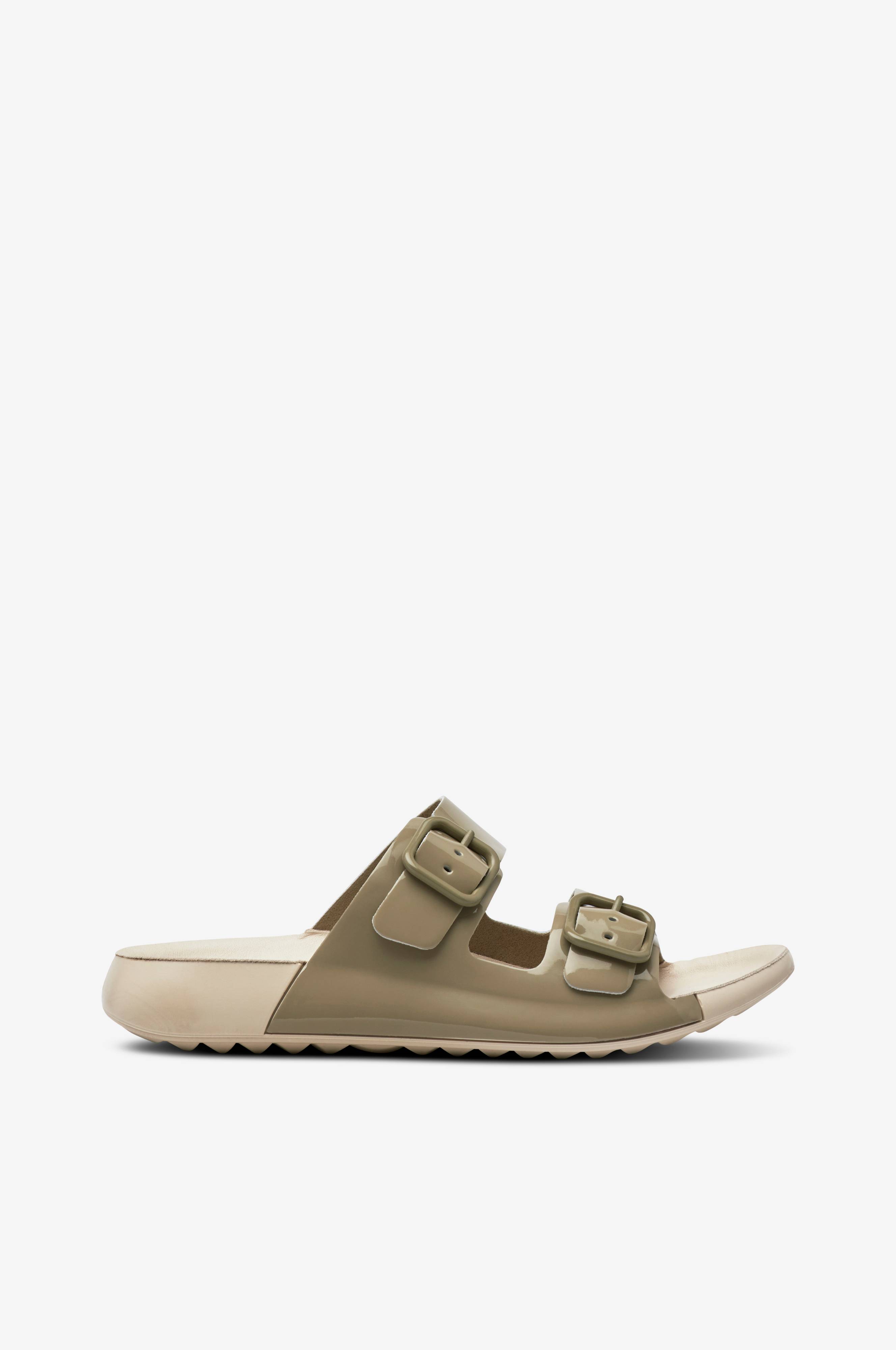 Sandaalit lakattua, kiiltävää nahkaa. Jalan päällä kaksi säädettävää remmiä. Anatomisesti muotoiltu sisäpohja. Valmistettu innovatiivisella tavalla, jossa hyödynnetään Eccon FLUIDFORM™-tekniikkaa. Joustava pohja.