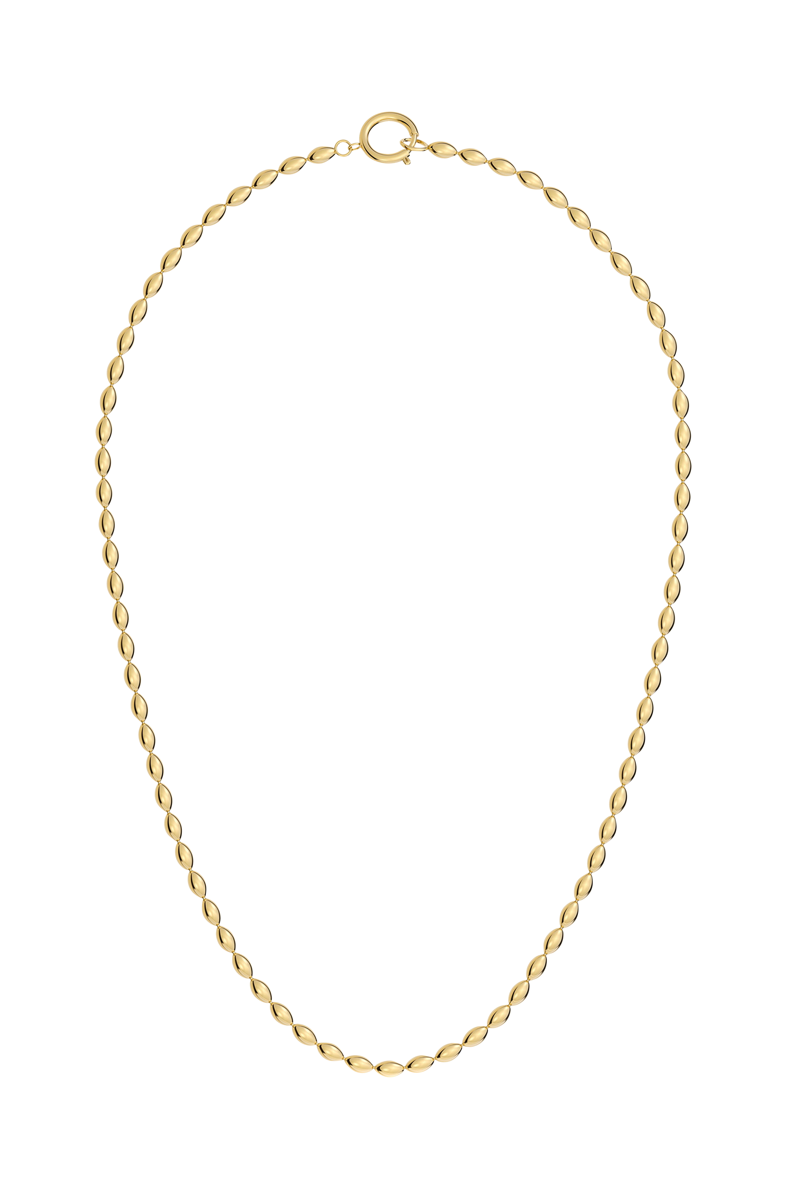 Kaulakoru, jossa on pieniä pyöreitä soikeita metallihelmiä, jotka on yhdistetty lyhyellä metallitangolla.