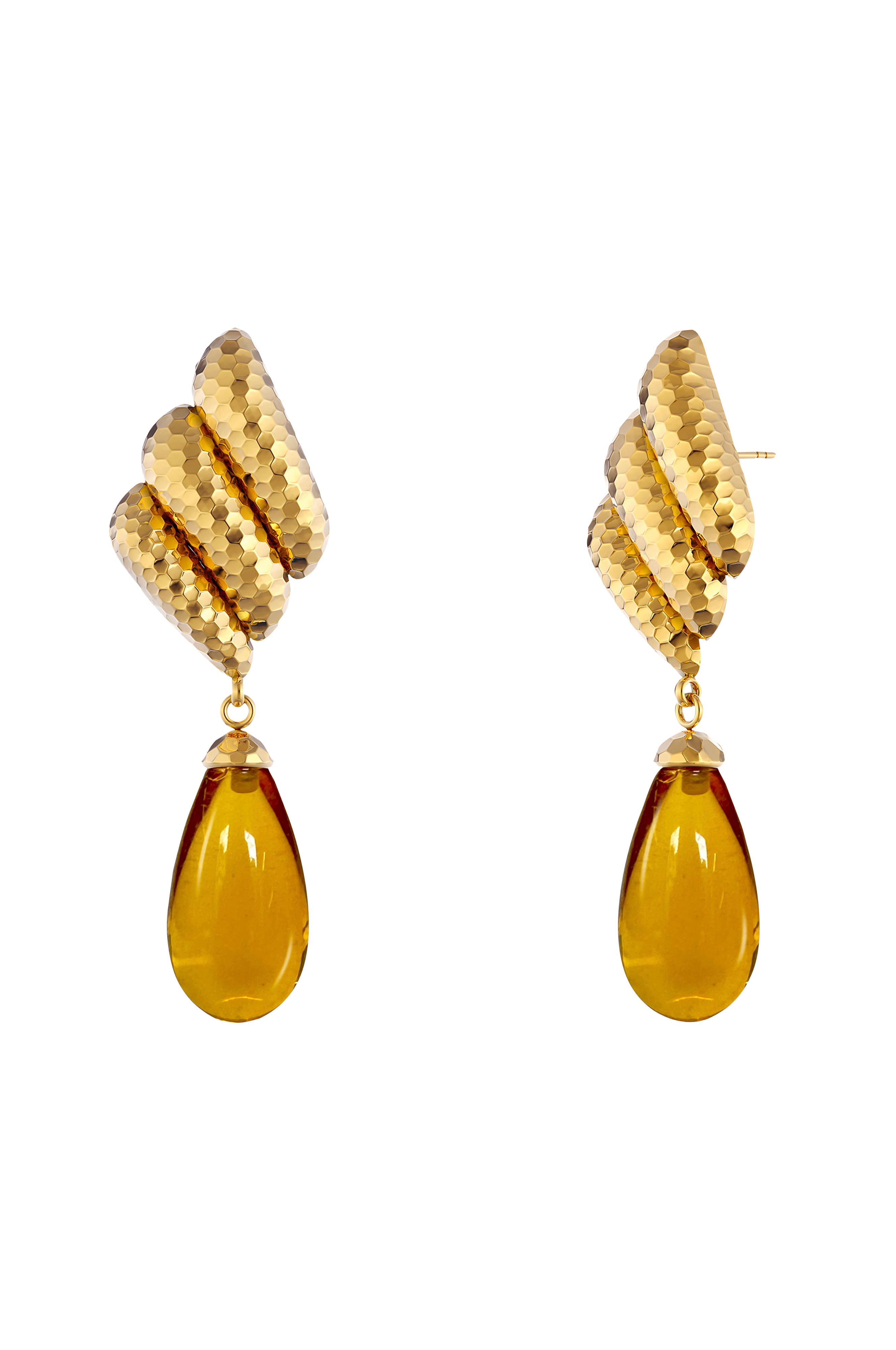 Cali-korvakoruissa on kierrätetty meripihkanvärinen lasihelmi ja kiiltävä 14 karaatin kullattu pinnoite.