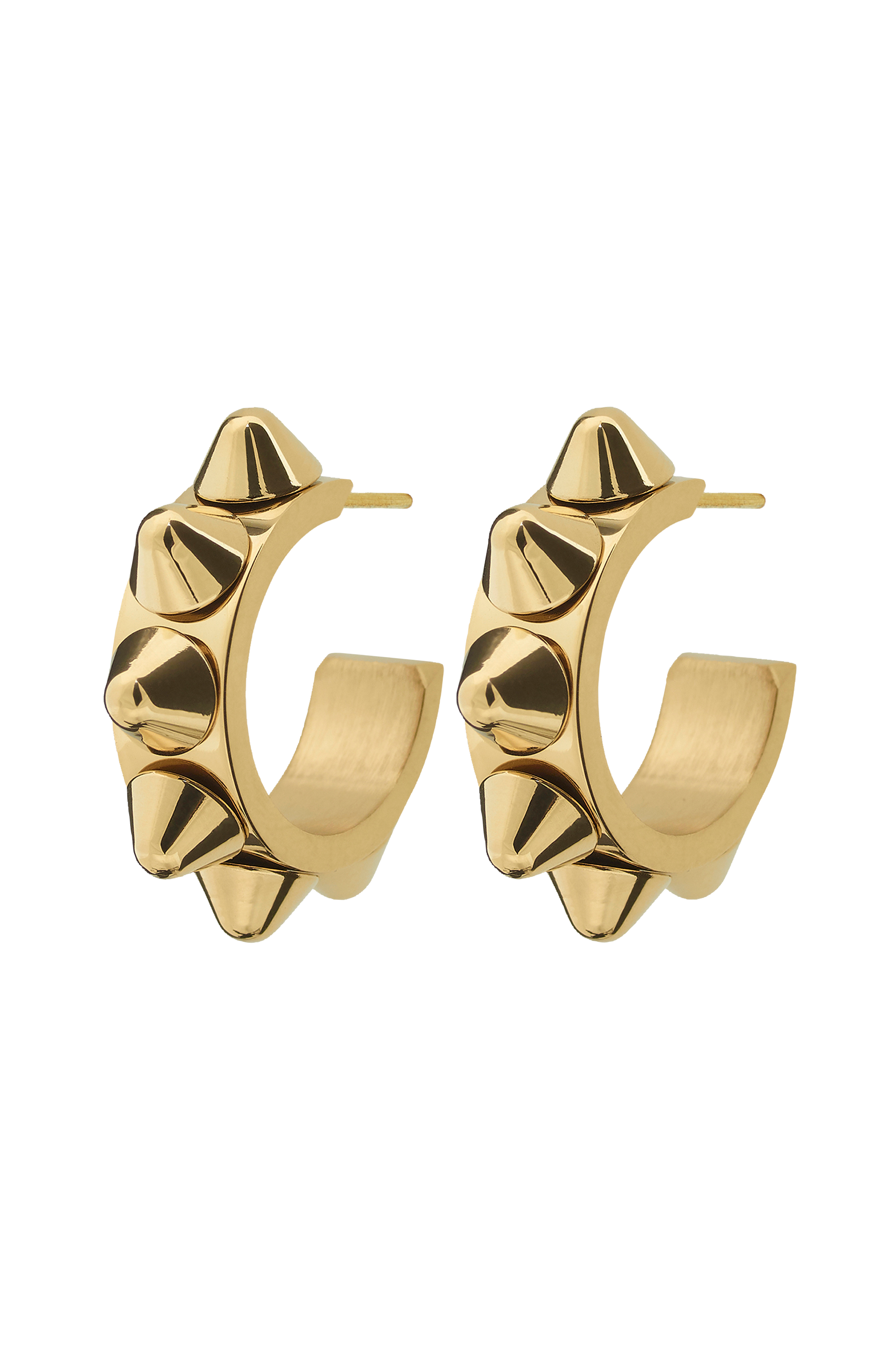 Edblad Peak Creole Earrings Small Gold -korvakorut, joissa pieni ympyränmuotoinen malli. Pienet terävät niitit muistuttavat vuorenhuippuja. Ruostumatonta terästä, jossa kiiltävä 14 karaatin kultapäällyste. Halkaisija 20 mm, leveys 5 mm. Niittien korkeus 5 mm. Eivät sisällä nikkeliä.