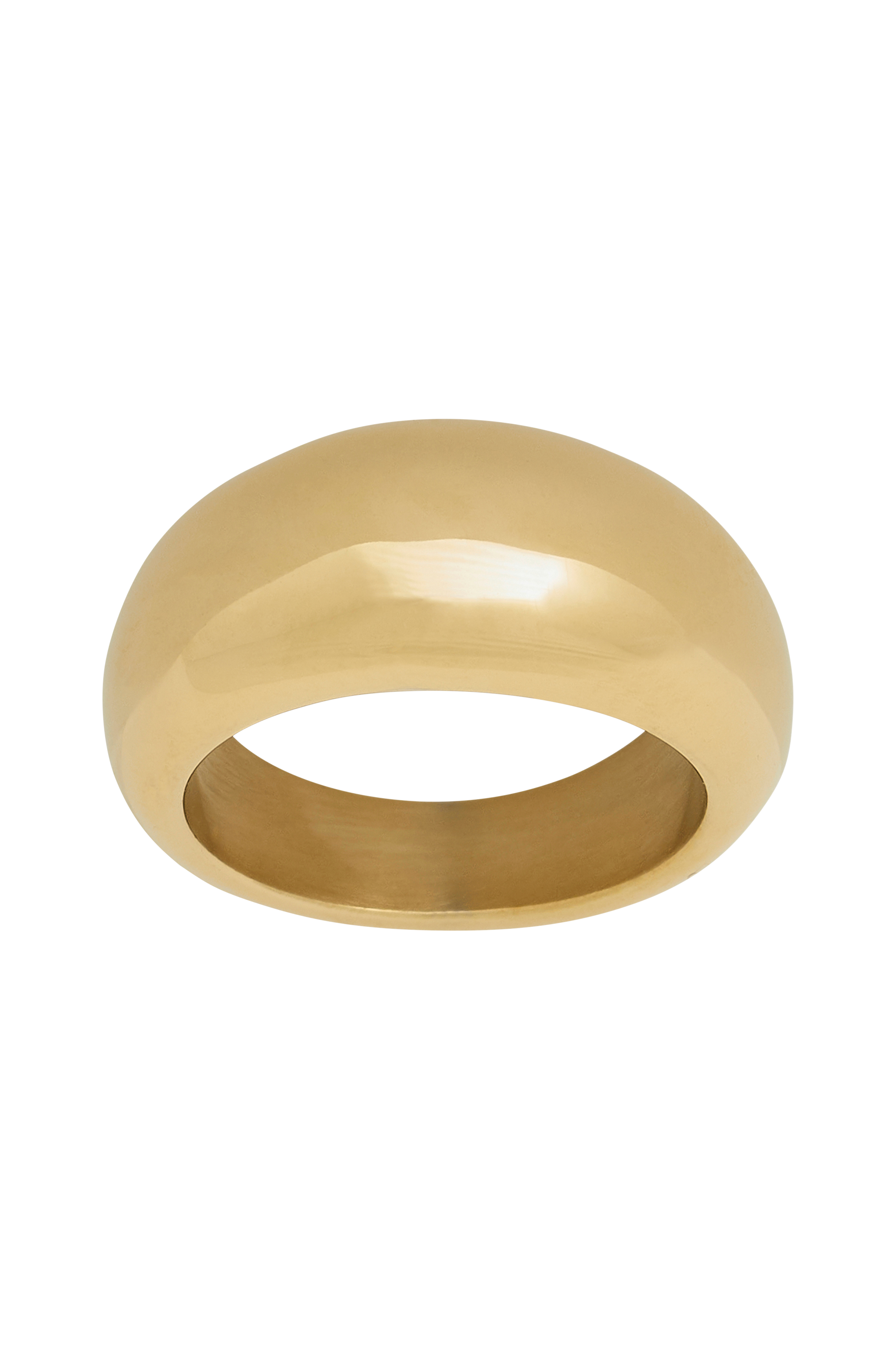 Pyöreän muotoinen sormus, joka kapenee sormen ympärillä niin, että sitä on mukava käyttää. Leveys n. 5-10 mm. Ruostumatonta terästä, jossa kiiltävä 14 karaatin kultapäällyste. Nikkeliturvallinen.