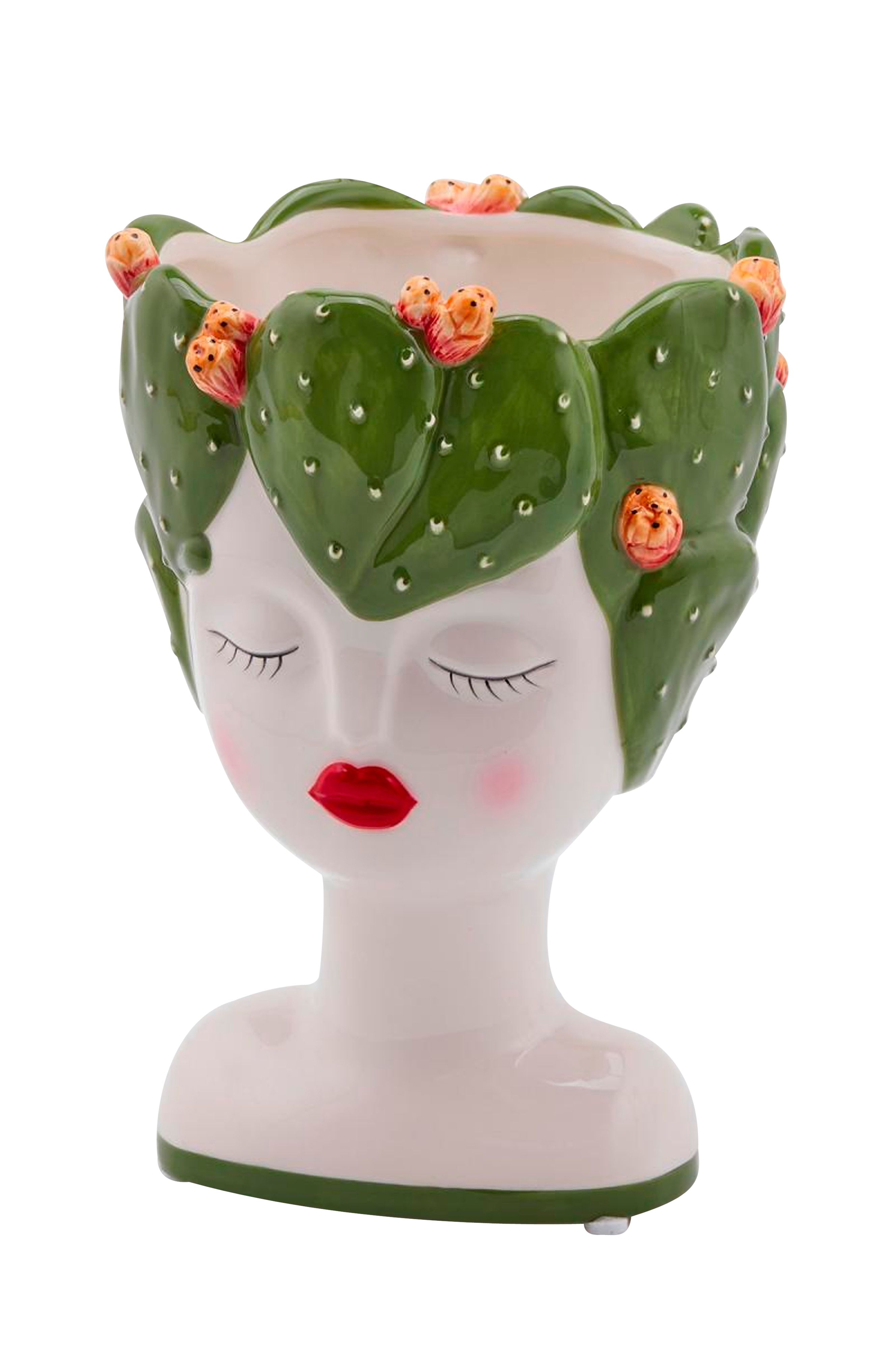 Upea keramiikkamaljakko esittää kauniita kasvoja, ja siinä on koristeellinen kaktus- ja kaktuksenkukkakruunu. Maljakossa on kauniit värit, ja se kohottaa minkä tahansa huoneen ilmettä! Koko 23 x 16 cm.