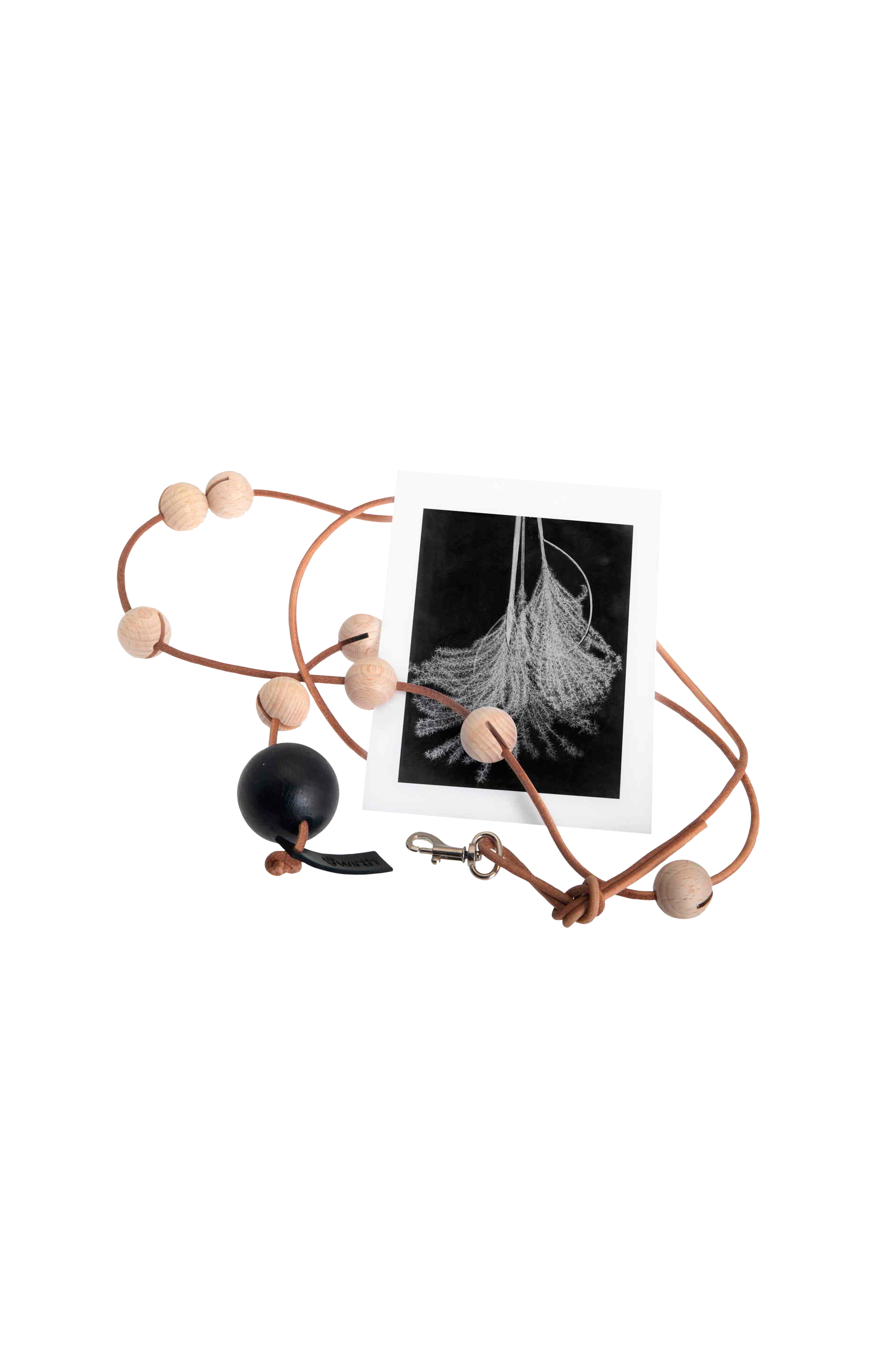 All On A String on fiksu ja koristeellinen nahkaremmi postikorteille. Luo oma pienoisnäyttelysi kiinnittämällä siihen suosikkipostikorttejasi, valokuvia tai piirustuksia. Mitat: pituus 170 cm. Materiaali: koivua, nahkaa, metallia.