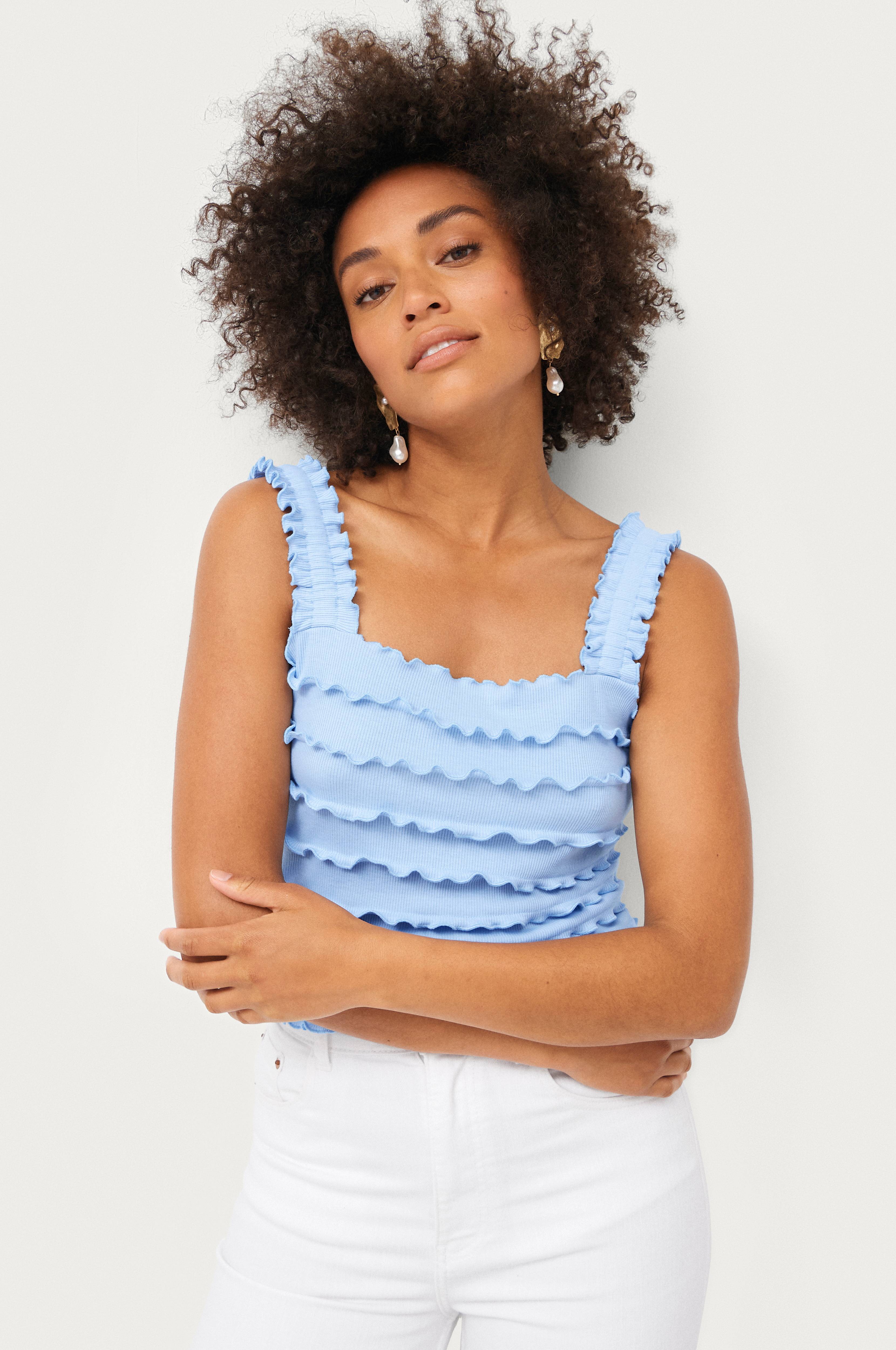 • Lyhyt malli ribatusta trikoosta röyhelöillä