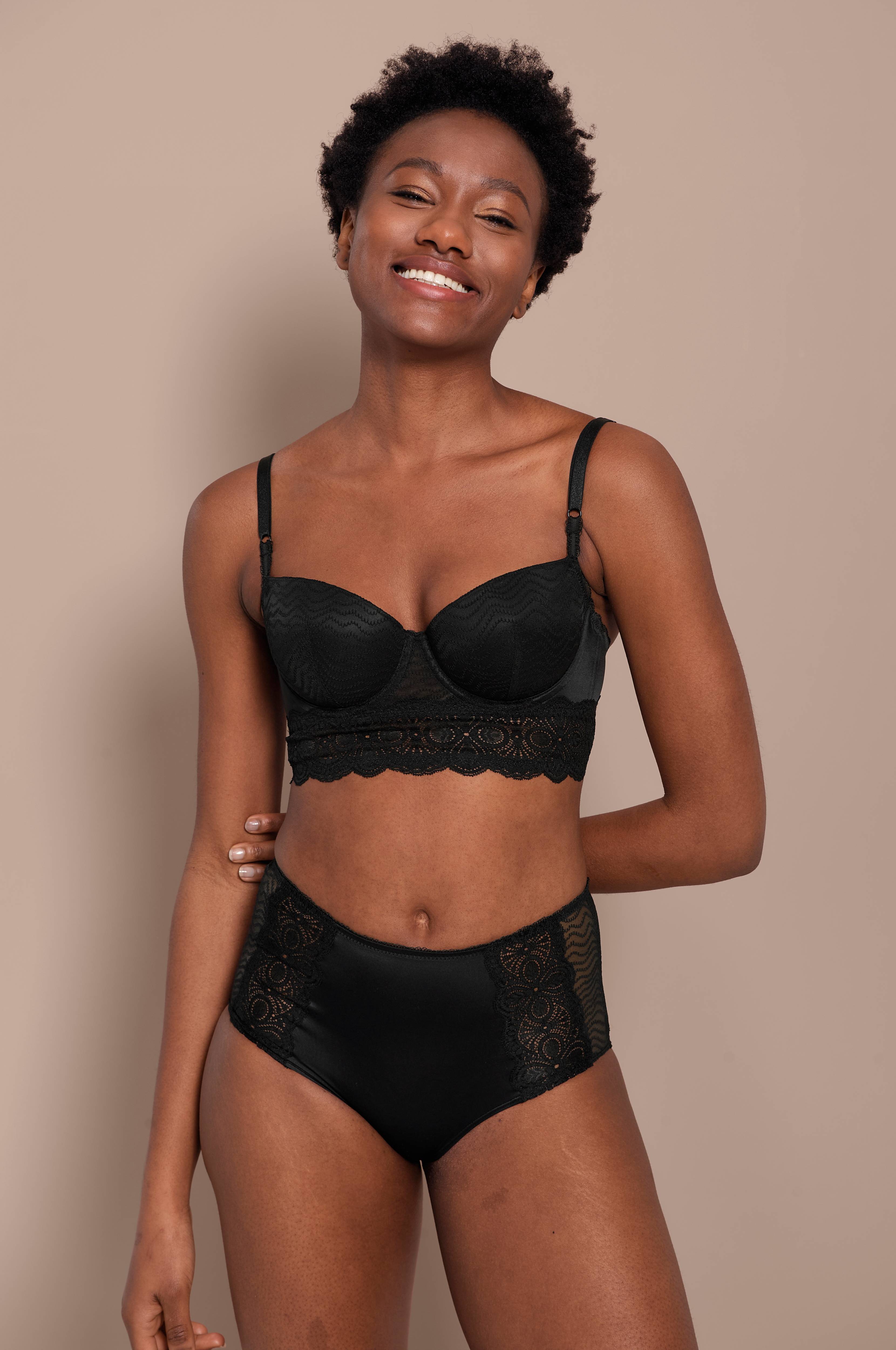Balconette-liivit, joissa kaarituet ja kevyesti topatut kupit. Erittäin leveä pitsireuna alhaalla ja sivuilla tasapainottavat kaaret, jotka antavat lisää tukea. Säädettävät olkaimet ja erittäin leveä hakaskiinnitys selässä.
