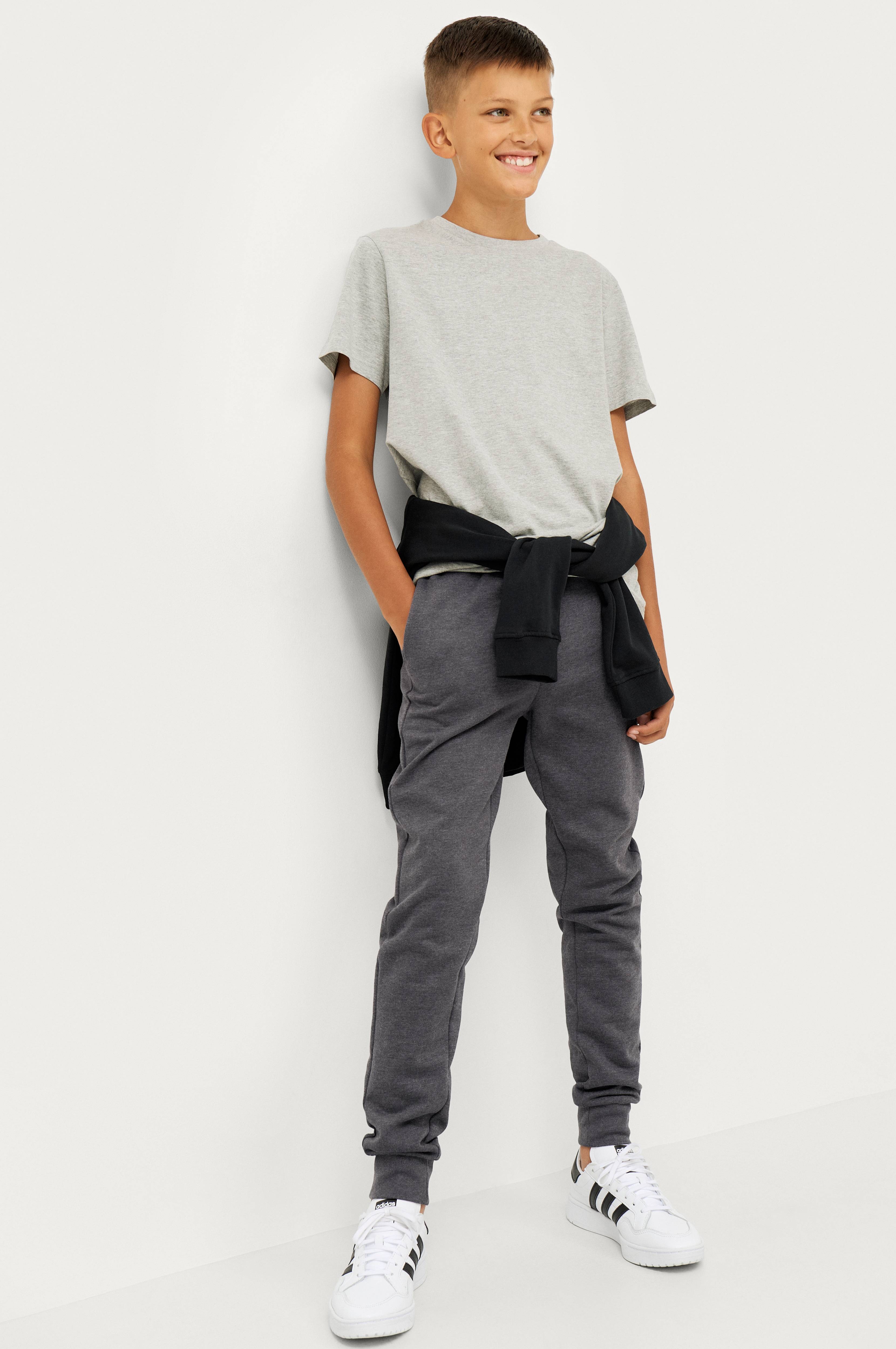 Housut pehmeää materiaalia. Väljät reidet ja kapenevat lahkeensuut, joissa resorit. Upotetut taskut ja päälleommeltu vyötärönauha, jossa upotettu kuminauha ja upotettu nyöri.