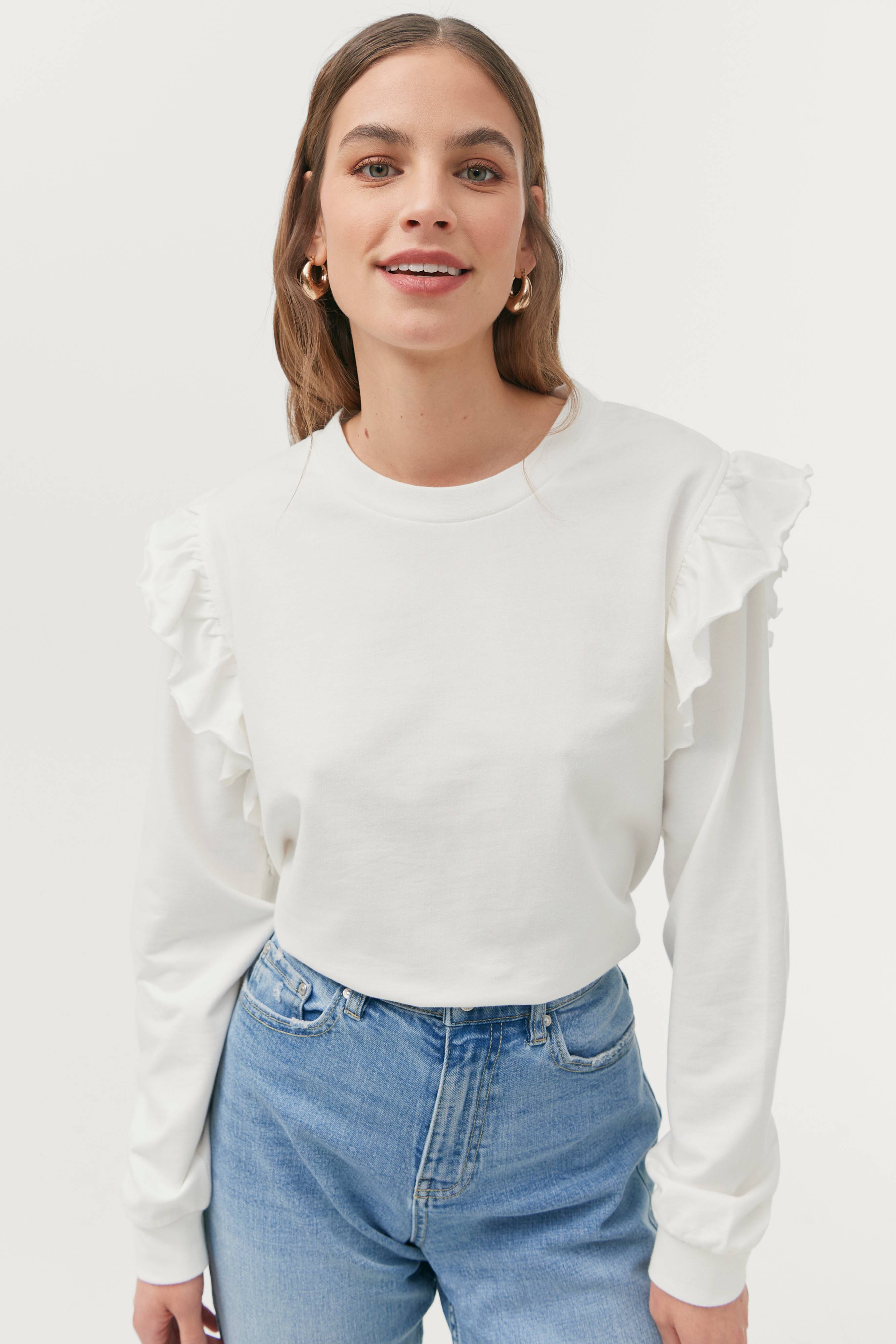 Etna-collegepusero. Suora oversize-malli, jossa röyhelöt olkapäillä. Pyöreä pääntie, jossa joustinneulosreunus. Resori hihansuissa ja helmassa. Pituus n. 58 cm koossa 34/36.
