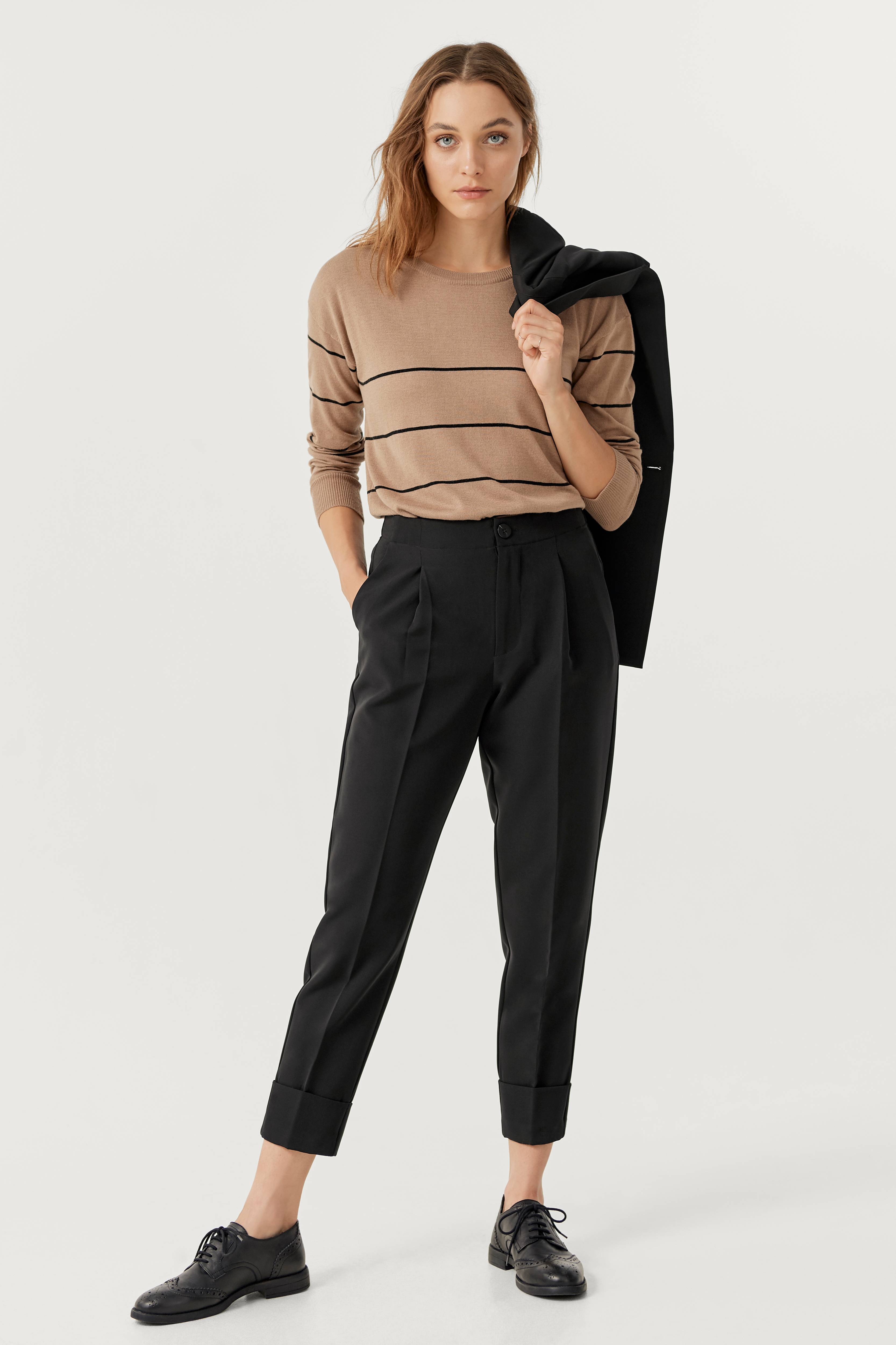 Harleen-housut. Huoliteltu malli ja lyhyehköt kapenevat lahkeet, joissa prässit ja leveä kiinniommeltu käänne lahkeensuissa. Ommellut laskokset vyötäröllä edessä, sivutaskut ja valetakataskut. Upotettu, poimutettu kuminauha vyötäröllä takana. Etuhalkiossa vetoketju ja nappi. Mustat housut ovat joustavat. Lahkeen sisäpituus n. 68 cm koossa 36.