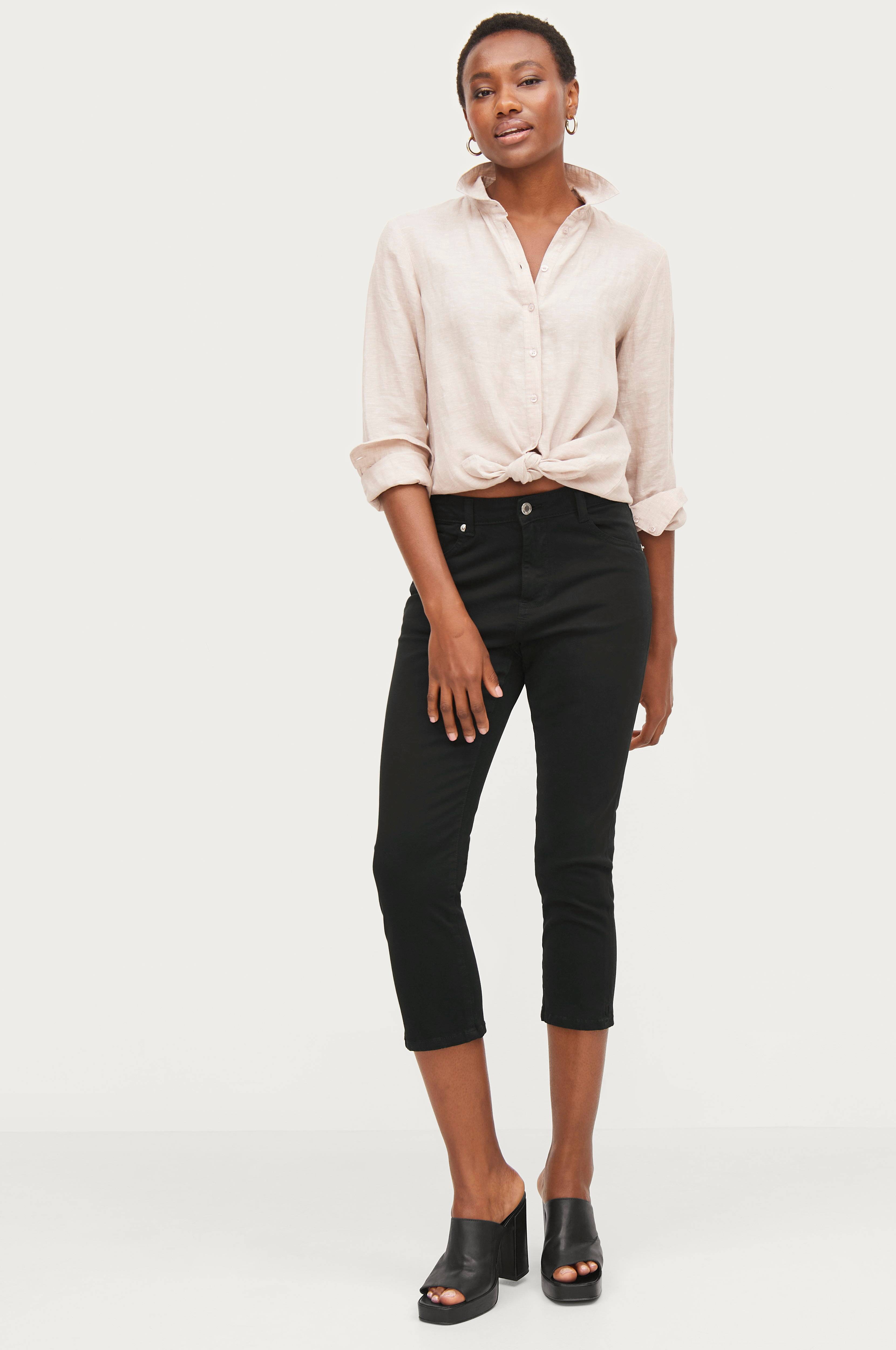 Pohjepituiset housut stretchmateriaalia. Kapea istuvuus, viisi taskua ja vetoketjullinen etuhalkio. Pieni halkio lahkeensuissa.