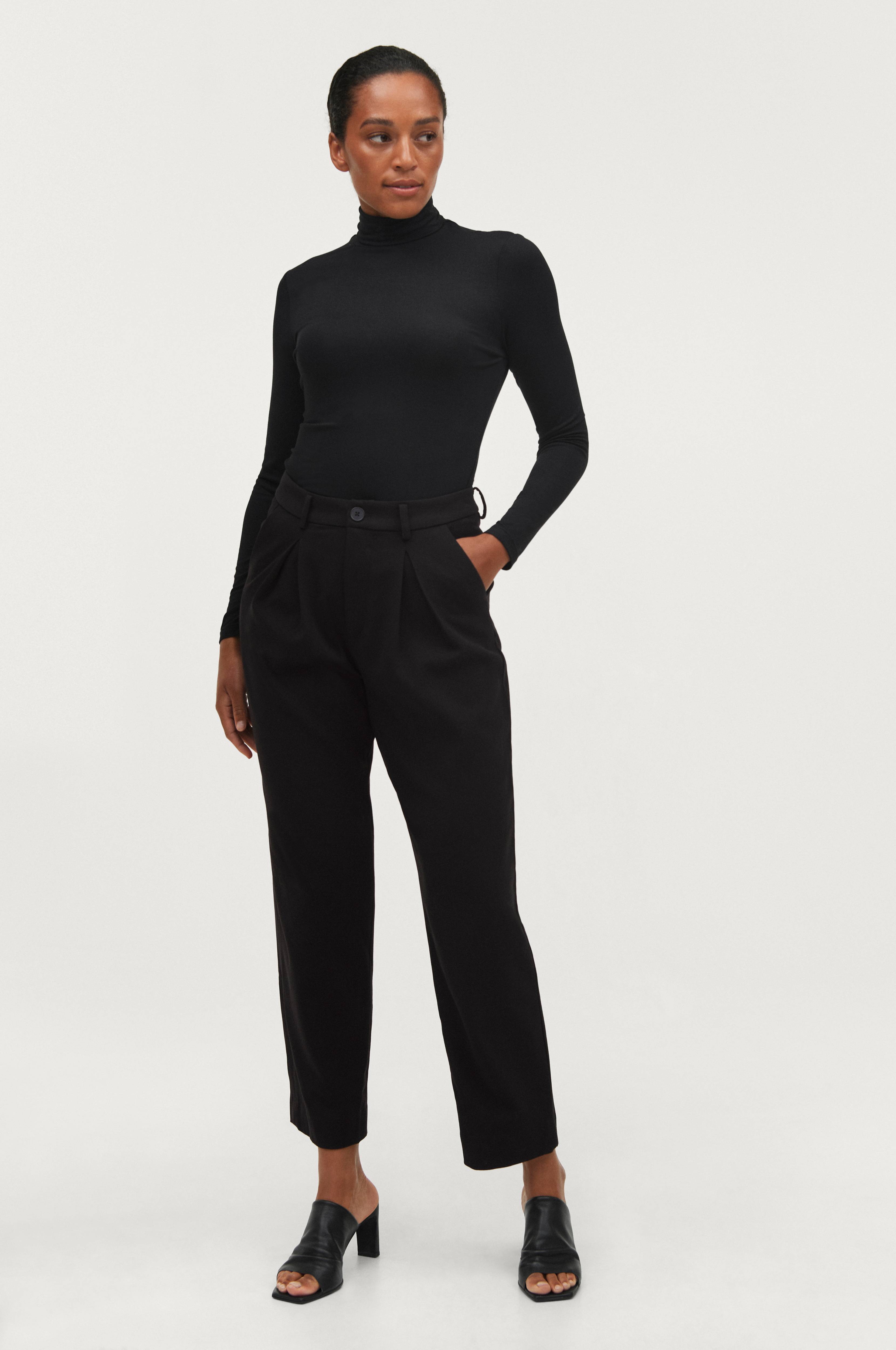 Kris-housut, joissa huoliteltu malli. Korkea vyötärö, nilkkapituiset lahkeet ja leveät reidet. Vastalaskos vyötäröllä edessä, sivutaskut, vetoketjullinen etuhalkio ja nappi. Valetakataskut.