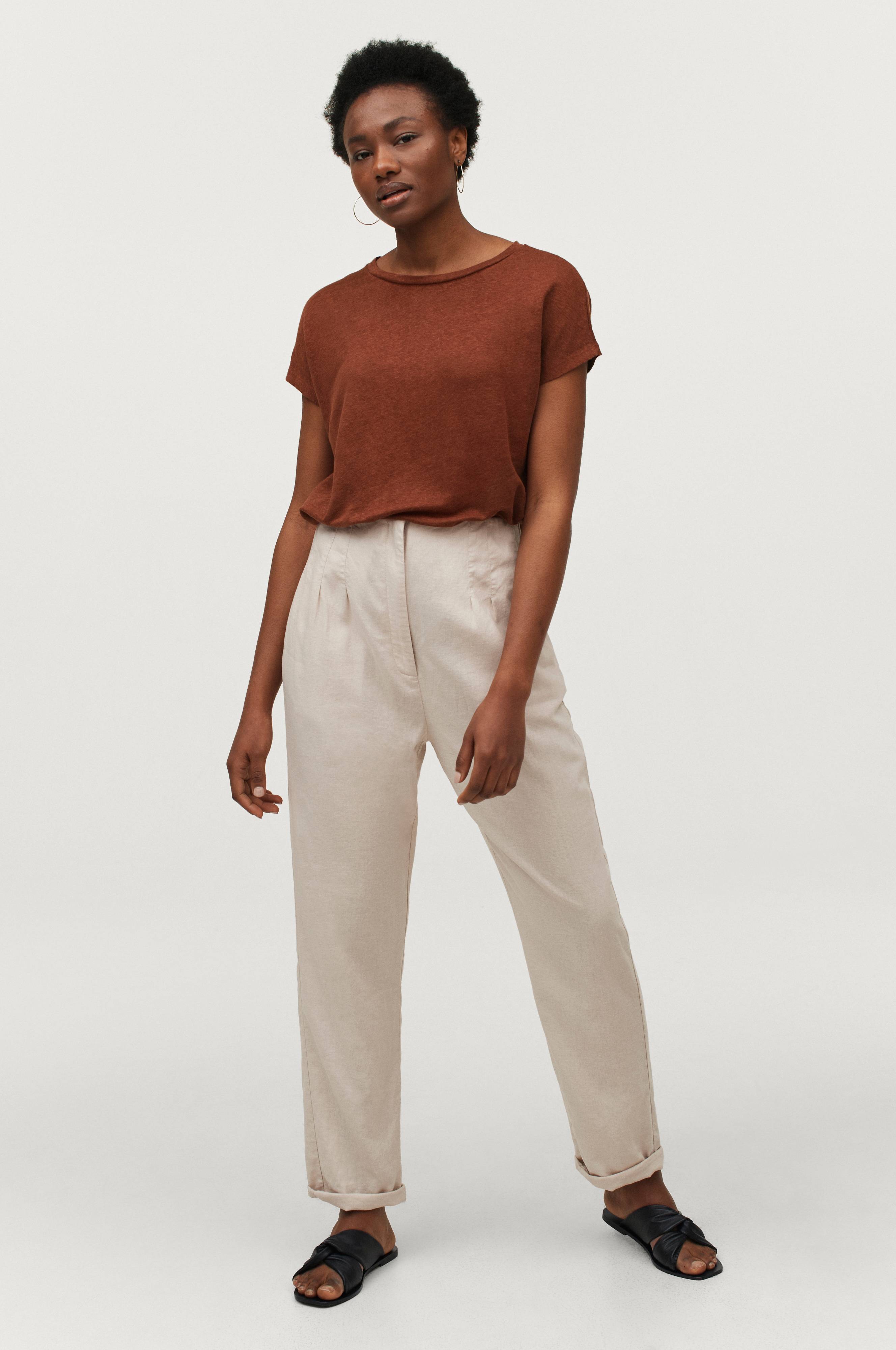 Leveät lahkeet ja kapenevat lahkeensuut. Nilkkapituinen malli. Korkea vyötärö, edessä vetoketju, ommellut laskokset ja kaksi viistoa taskua. Vyötärön sisäpuolella takana kuminauha. Lahkeen sisäpituus n. 76 cm koossa 36.